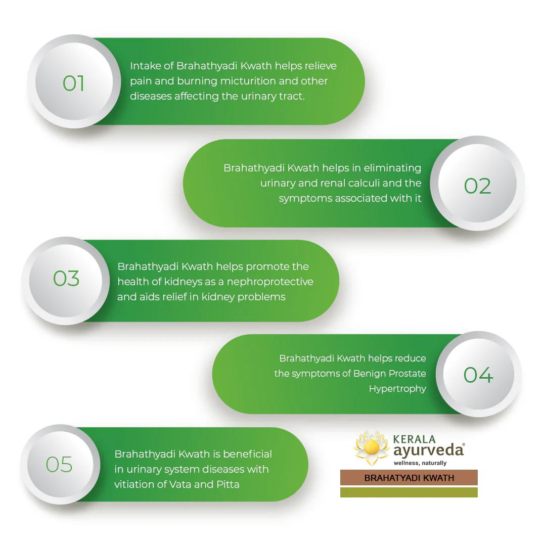 Brahatyadi kwath is an herbal medicine used in healing diseases of the urinary system. The intake of Brahatyadi Kwath helps relieve pain and burning micturition and other diseases affecting the urinary tract. Relieves urinary calculi, burning or painful micturition. Used in urinary infection, cystitis. Has diuretic action.