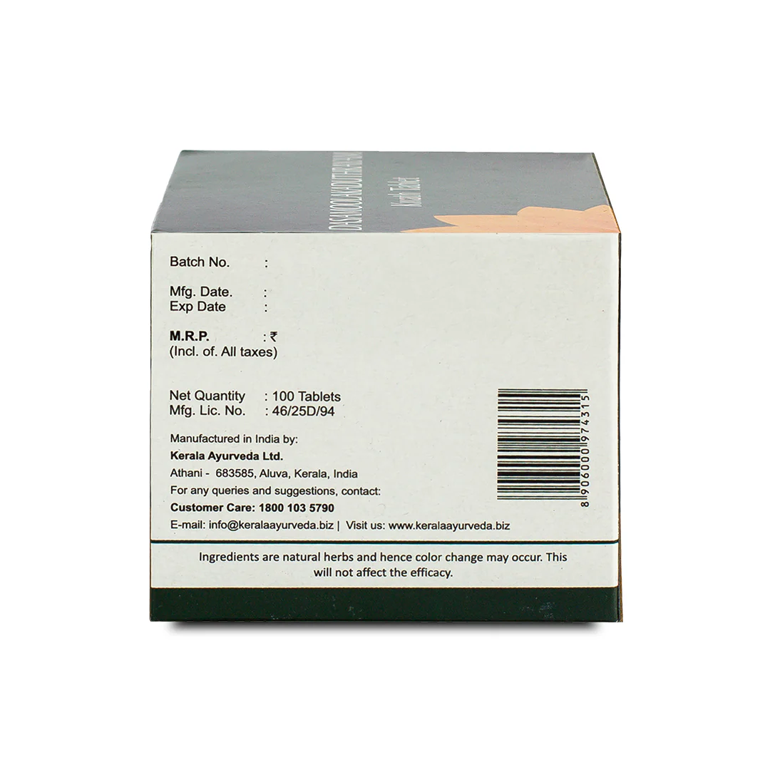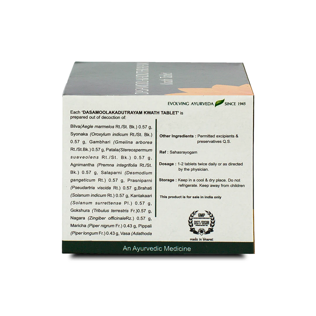 Dasamoolakaduthrayam Kwath Tablet is a form of the Dasamoolakaduthrayam Kashayam. This kashayam is known to be widely used in the Ayurvedic treatment for cough and cold. In the tablet form, this medicine retains its original efficacy but is more convenient to store and use. Dasamoolakaduthrayam Kwath Tablet for cold and cough: Contains several key ingredients known to be helpful in treating respiratory disorders that cause productive coughs. These ingredients are commonly used in Ayurvedic medicine for cough and cold treatment, as well as productive cough relief. Roots like Nagara: Help support good digestion and find relief from flatulence.