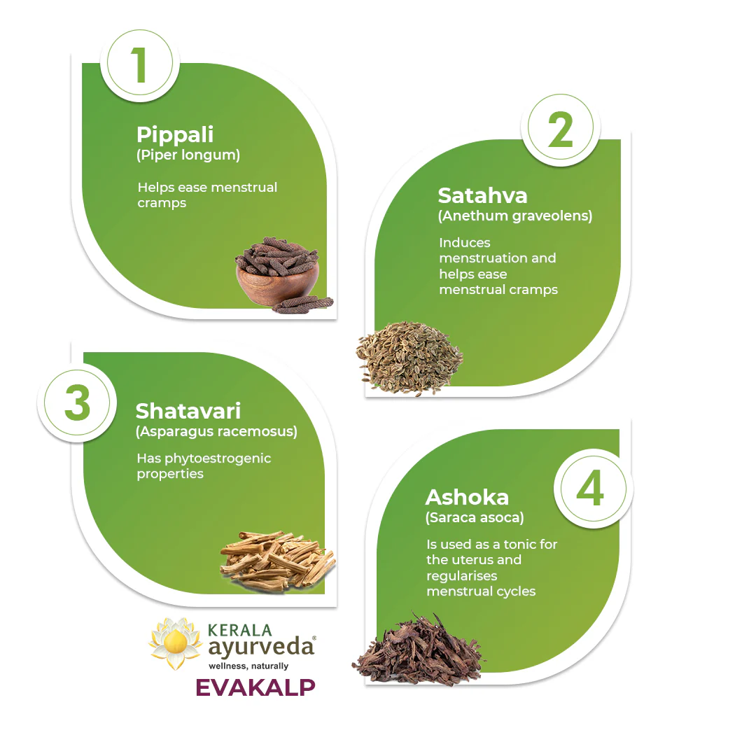 Kerala Ayurveda Evakalp tablet is an Ayurvedic uterine supplement that promotes overall uterine health. By incorporating the goodness of Kanasathahvadi Kwath, along with Asoka, satavari, and methi, it help restore hormonal balance, alleviate period cramps, reduce mood swings, and effectively address irregular monthly cycles. It also helps enhance uterine contraction and stimulates bleeding. Helps manage pre-menstrual symptoms including leg cramps, mood swings, muscle spasms, pain, headache, and nausea. Enhances uterine contraction and stimulates bleeding. Promotes overall uterine health. Minimizes the symptoms of PCOD.