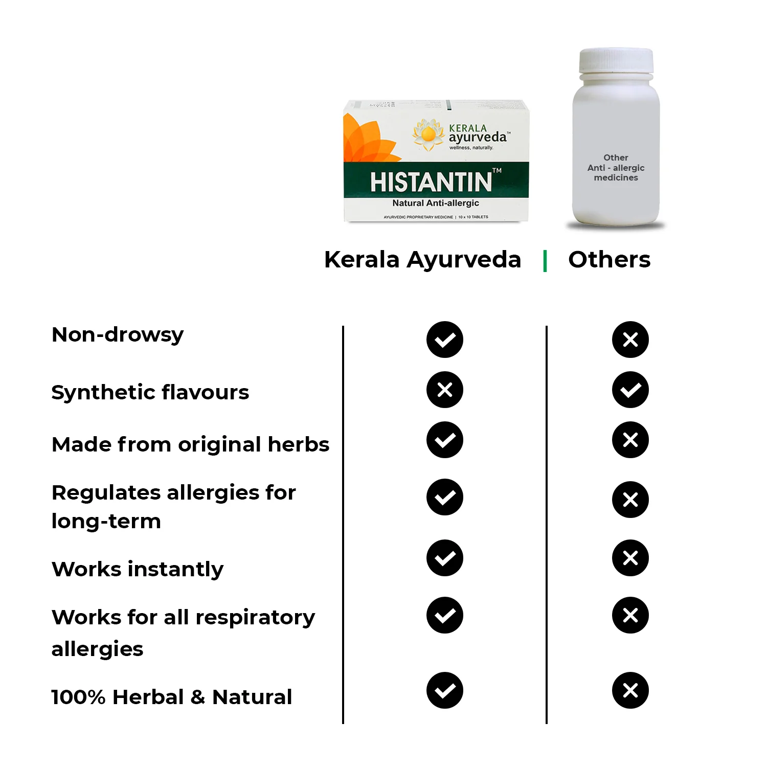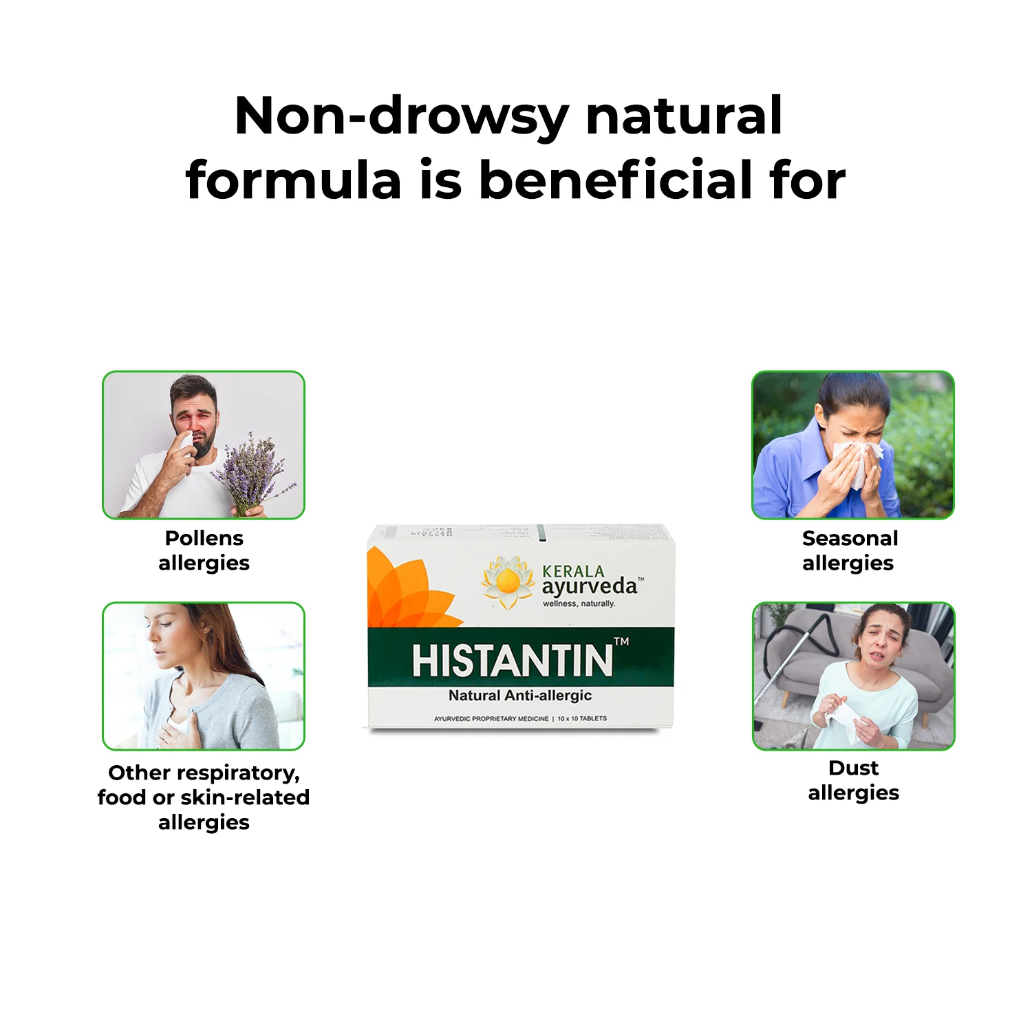 Bamboo Silica (Vamshalochanam): Helps ease colds and running nose. Green Chiretta (Bhunimba): Helps regulate immune response and prevent infections. Turmeric (Haridra): Helps ease allergy symptoms and boost immunity. Sickle Pod (Prapunnada): Beneficial for skin allergies. Dosage: 2 tablets of Histantin Tablets 3 times a day, 30 minutes before or after a meal. Duration: Recommended to take for a week and can be continued if the symptoms persist