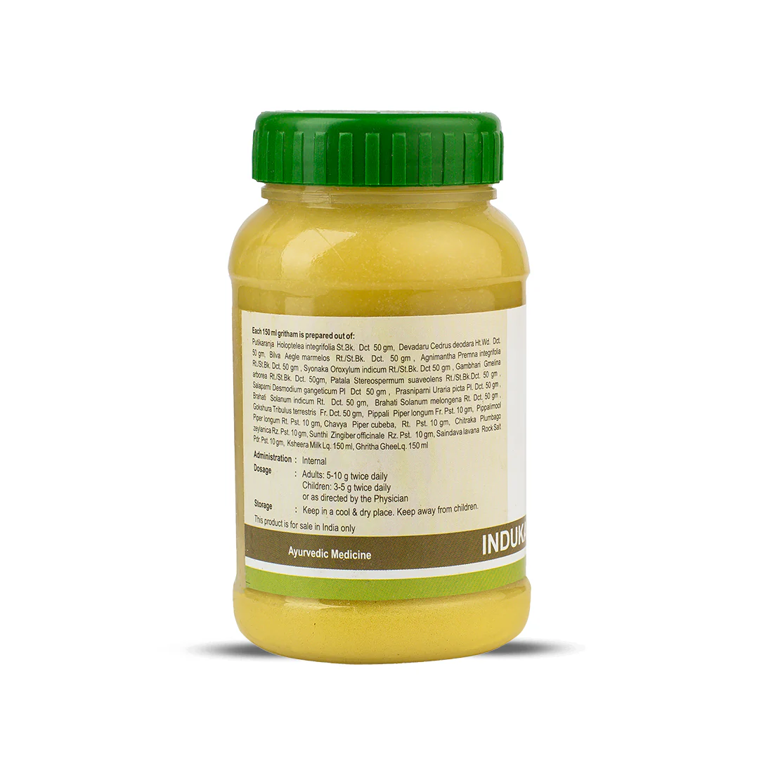 Indukantha Ghritham is a classical Ayurvedic ghee formulation crafted from an ancient Malayalam recipe book, Sahasrayogam. Its name, 'Indukantha,' mirrors the luminosity of the moon. When sickness dims your inner light, Indukantha Ghritham is here to reignite it, fortifying your immunity and quickly replenishing your energy, much like a radiant full moon illuminating the dark sky. This herbal-infused ghee invigorates your digestion and metabolism, aiding in weight regain after an illness. Suitable for children and adults who often fall ill, Indukantha Ghritham is a potent immunity enhancer. Ghee carries a remarkable quality known as 'Samskarasya Anuvartanat,' which absorbs the goodness of added herbs without losing its benefits. Infused with nourishing, immunity-strengthening herbs, Indukantha Ghritham promotes healthy weight gain. Let it help your inner light shine more brightly than ever before.