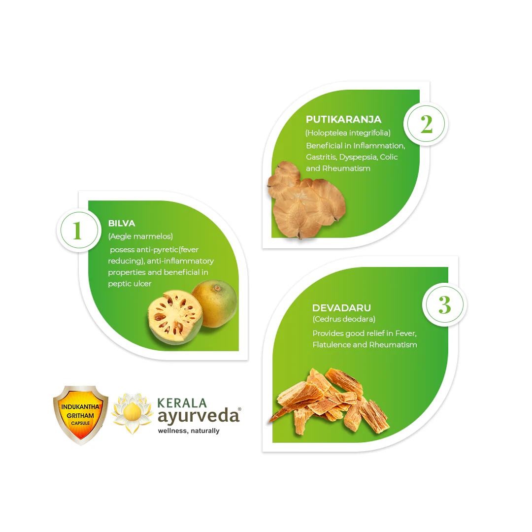 Indukanta Ghritam is an Ayurvedic formulation available in the form of medicated ghee and as a capsule. In Sanskrit Indu means ‘Moon’ and Kanta’ means ‘Lustre’, thus Indukanta means glow and lustre of the Moon. This medically treated capsule helps to correct metabolism and is found to be helpful in establishing lost immunity. This immunity boosting ayurvedic medicine is also one of the prescriptions to help heal individuals from chronic fevers and many other conditions. This is a medicated ghee containing Dashmula and many other medicinal herbs and indicated in the treatment of weakness, chronic fever, vata roga, tuberculosis and peptic ulcer. It is a useful medicine for improving appetite, digestion and curing abdominal diseases. It is prescribed to be an excellent remedy for treating cough in old age. Since it is a ghee based medicine, it increases strength and immunity of the body.Indukantha Gritham is a formulation referred to in the text of Sahasrayogam in the context of Gritha yogam. It is a potent formulation which helps to enhance immunity with special indication in respiratory disorders and recurrent fevers. Antioxidants play a significant role in improving the immunity and thereby in combating these conditions.Indukantha Gritham capsules are a poly herbal medicated ghee preparation containing an ideal combination of herbs, such as Putikaranja, Devadaru, Dasamoola, Trikatu, Chitraka and Saindhava which are said to nourish the mucosa of GIT and provide immunity, strength and resistance to the body. This Ayurvedic medicine for fever retains all the activities of the classical Indukantha Ghritham in capsule form and is classically one of the prescriptions to treat fever and other abdominal disorders. It also helps to relieve bloating, abdominal distention, and loss of appetite.Indukantha Ghritham capsule retains all the activities of the classical Indukantha Ghritham but in the capsule form, ie. It is known to work well as an immunomodulator, antipyretic, anti-ulcerogenic, and also as a digestive and laxative.