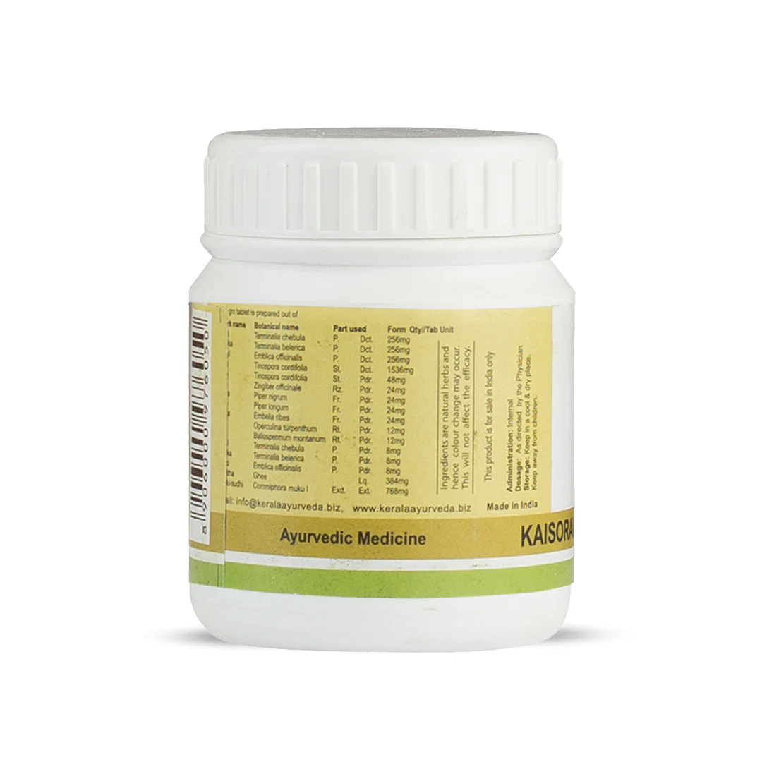 Kerala Ayurveda Kaisoravatakam Gulika is a classical Ayurvedic formulation in tablet form, effective in various skin disorders and rheumatism. It helps to relieve various types of skin disorders including Psoriatic arthritis. The anti-inflammatory properties of the ingredients in Kaisora Vatakam make it beneficial in the treatment of ulcers, carbuncles, and rheumatism. It also helps in alleviating the symptoms related to the fistula. It is beneficial in various types of skin disorders. Aids relief in rheumatic complaints. The anti-inflammatory effect helps in faster healing of ulcers and wounds. Aids faster healing in fistula. Helps in balancing Tridoshas.