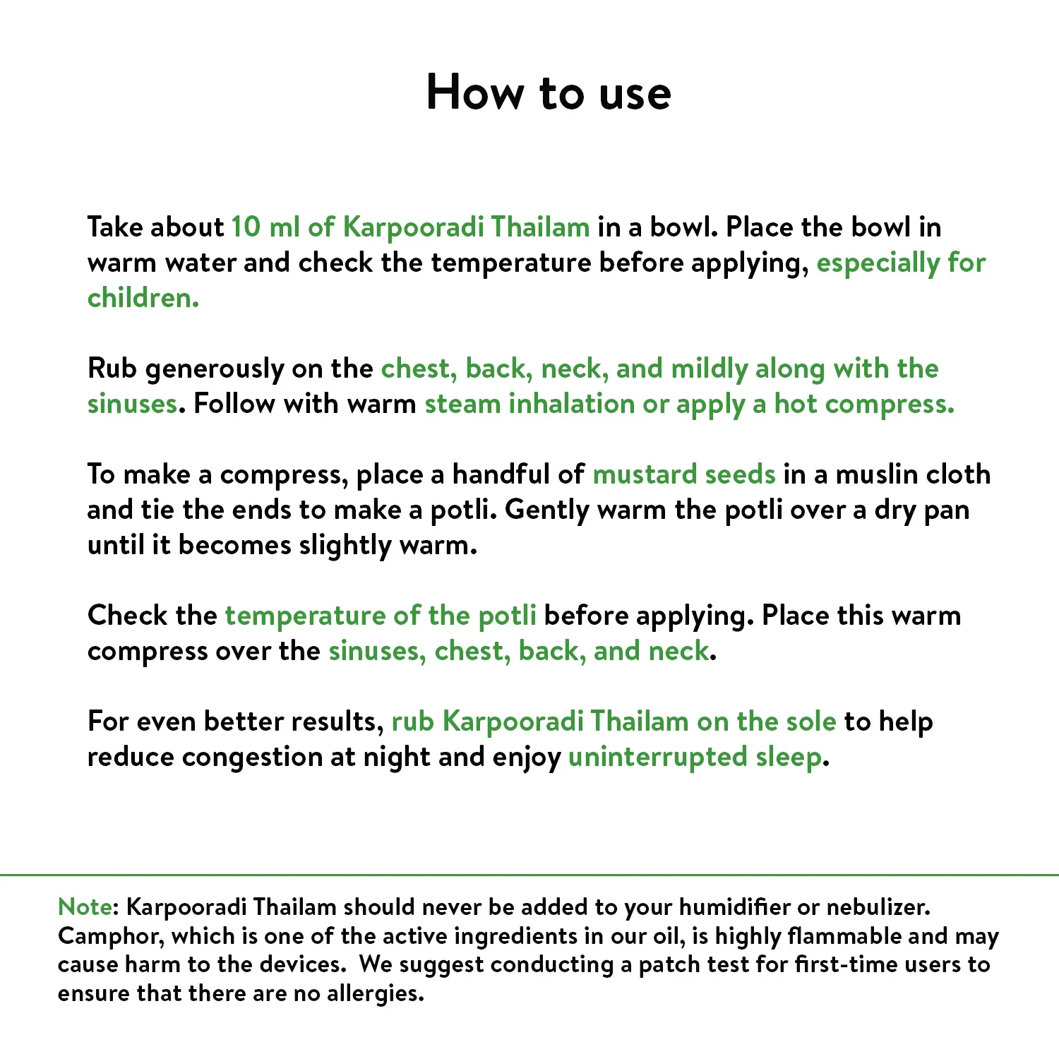 Ayurvedic chest rub oil - Kerala Ayurveda Karpooradi Thailam: the ultimate herbal solution for chest congestion. This chest rub oil is crafted with a powerful blend of warming herbs designed to soothe and comfort your respiratory system. Quick relief from cold, cough, and congestion: Don't let a cold or cough slow you down. Get fast and natural relief with Karpooradi Thailam. This specially formulated blend of natural ingredients is designed to ease congestion and expel mucus, providing quick relief from cough and chest discomfort. Must-have for the rainy season and winters: Prepare yourself for the rainy season and winters with Kerala Ayurveda Karpooradi Thailam. Don't let runny noses and colds slow you down this flu season. This powerful natural remedy gives you the relief to keep going strong. Safe alternative for kids: Kerala Ayurveda Karpooradi Thailam is a safe and gentle relief for your little one's respiratory system. This unique blend is free from harmful ingredients, making it a safe alternative for your child's delicate respiratory system. Camphor or Karpoora: Clears congestion and balances Kapha dosha. Celery or Ajamoda: Clears airways with warming properties. Coconut oil: Soothing base of Karpooradi Thailam for relieving cold and congestion symptoms. Usage: Take about 10 ml of Karpooradi Thailam in a bowl. Place the bowl in warm water and check the temperature before applying, especially for children. Rub generously on the chest, back, neck, and mildly along with the sinuses. Follow with warm steam inhalation or apply a hot compress. To make a compress, place a handful of mustard seeds in a muslin cloth and tie the ends to make a potli. Gently warm the potli over a dry pan until it becomes slightly warm. Check the temperature of the potli before applying. Place this warm compress over the sinuses, chest, back, and neck. For even better results, rub Karpooradi Thailam on the sole to help reduce congestion at night and enjoy uninterrupted sleep. Note: Karpooradi Thailam should never be added to your humidifier or nebuliser. Camphor, which is one of the active ingredients in our oil, is highly flammable and may cause harm to the devices. We suggest conducting a patch test for first-time users to ensure that there are no allergies. Target Audience: All Adults and Children above one year of age. Original Ayurveda | 100% Herbal and Natural | No added Fragrance or Colour | Chemical Paraben Free | No Mineral Oil or Petroleum by-products used