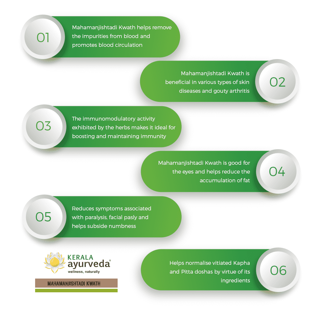 Manjistha (Rubia cordifolia): Manjistha is the essential ingredient of the Mahamanjisthadi Kwath. In Ayurveda, this herb helps with many ailments and illnesses. It has many health benefits, like blood purification and improving skin health. When applied externally, Manjistha helps in treating skin disorders. Haritaki (Terminalia chebula): This herb is used to balance all three Doshas. It is one of the Triphala herbs. The meaning of the word Haritaki is that which removes diseases and makes the body shine. It is used in Ayurveda as an antimicrobial, anti-bacterial, and to detoxify and support healing. It should be avoided during pregnancy. Bibhitaki (Terminalia belerica): This is also one of the famous Triphala herbs. The name Bibhitaki is derived from the word Bibhitaki, which means to be without the fear of disease. It is a laxative that eases motion and also a good Ayurvedic detoxifier that purifies muscles, fat, blood and lymph tissues. Bibhitaki balances the Kapha and Pitta Doshas. Amalaki (Emblica officinalis): Amalaki is the Indian gooseberry, also called Amla. Amla can balance all the three Doshas. It can be used in different forms to balance different Doshas. It is good for the health of the hair, eyes, and skin and gives general strength and vigour. Tikta (Solanum indicum): It is one of the potent Dasha Moola herbs. It balances the Kapha and Vata Doshas. Nisa (Curcuma longa): Turmeric has been used since ancient times to improve skin health. Nimba (Azadirachta indica): All the different parts of Neem tree are used in traditional folk medicine and Ayurveda. The bark and leaves of the Neem tree are used as a blood purifier. The neem tree balances the Kapha and Pitta Doshas.