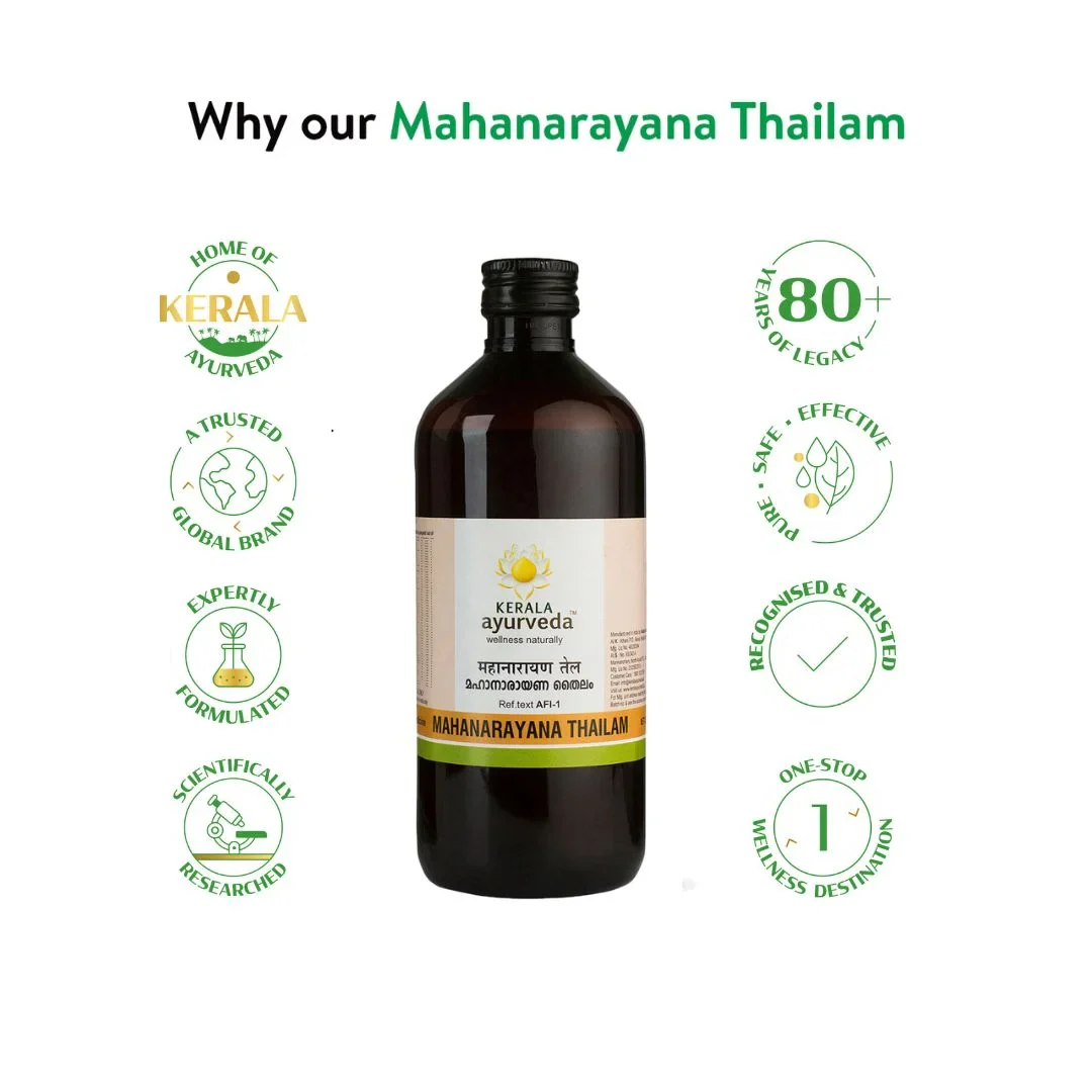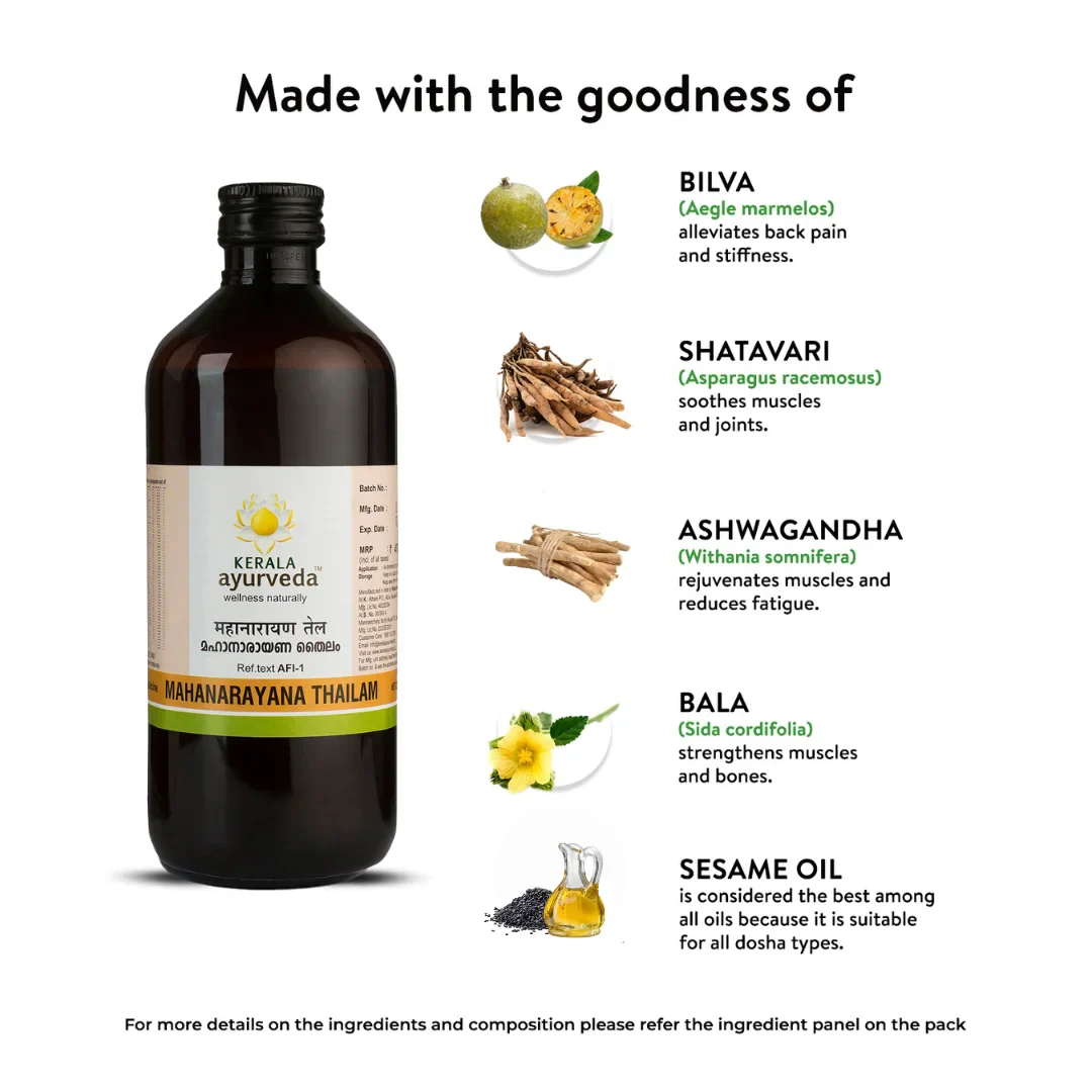 A traditional Ayurvedic formulation for post-work soreness. Kerala Ayurveda Mahanarayana thailam strengthens and rejuvenates the muscles providing relief from workout pains. The oil is also ideal for the elderly to aid relief from pain and aches and muscle stiffness, helping them to move effortlessly. Relieves post-workout pain Alleviate muscle soreness and stiffness Instant relief from aching muscles Improve joint flexibility