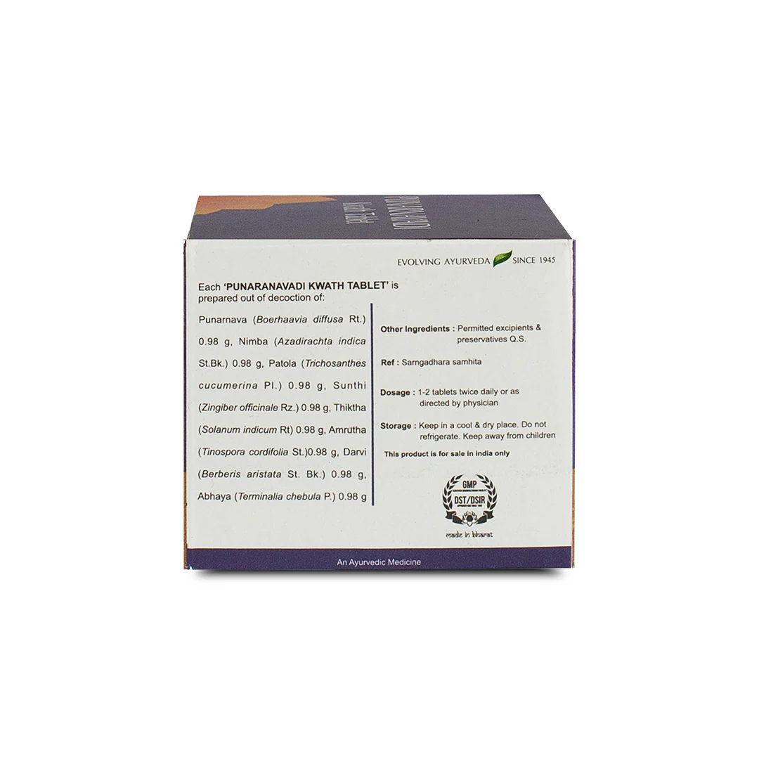 Punarnavadi Kwath tablet is the modified form of traditional Ayurvedic medicine that has anti-inflammatory properties that can help find relief from edema, inflammatory condition, fever and cough. Punarnavadi Kwath tablet is helpful in the Ayurvedic treatment of water retention and inflammatory conditions. It contains potent ingredients widely used in Ayurvedic medicine for cough. Some contain anti-inflammatory and antipyretic properties, making them viable for Ayurvedic fever medicine.