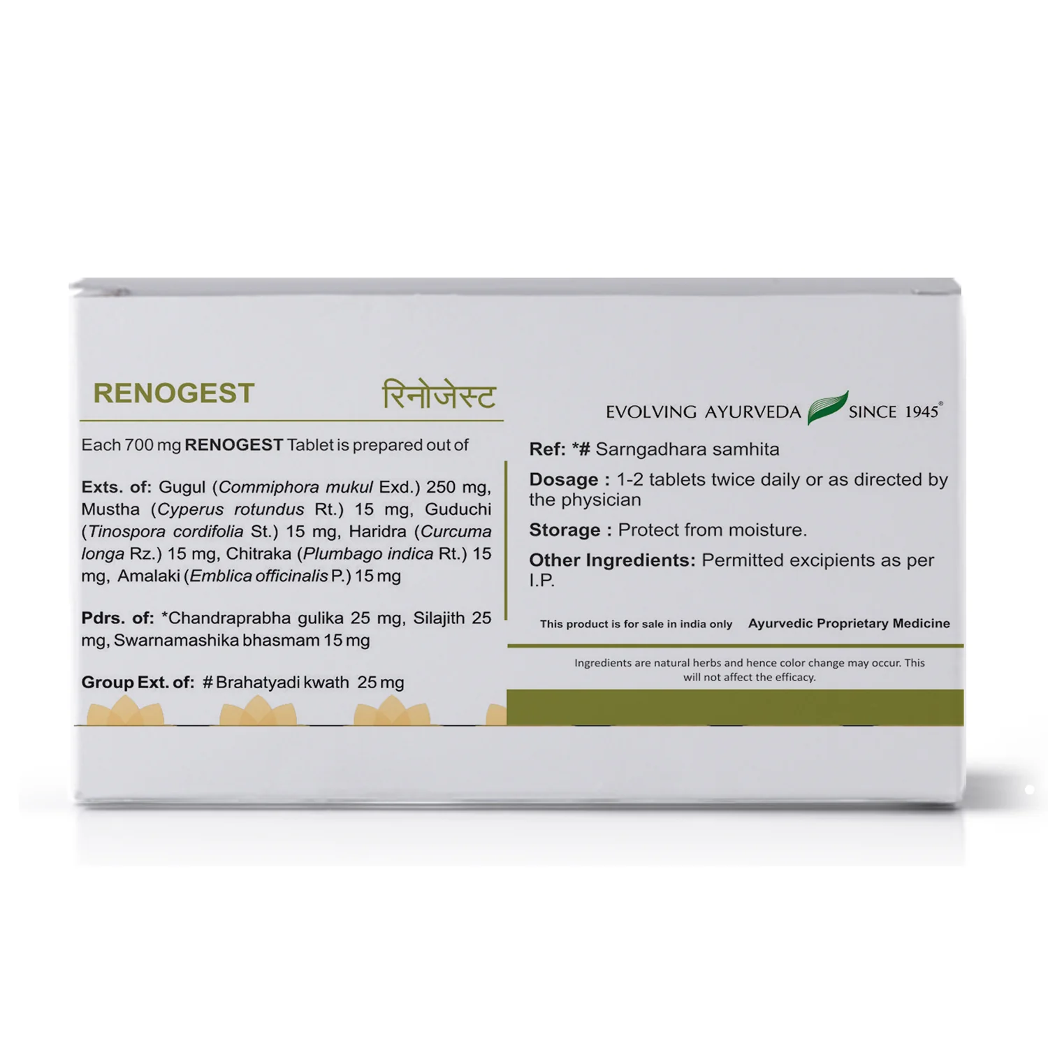 Renogest tablet is a unique proprietary formulation useful in recurrent urinary tract infections (UTIs). It is composed of a blend of herbs and classical formulation such as Musta (Cyperus rotundus), Guduchi (Tinospora cordifolia), Haridra (Curcuma longa), Citraka (Plumbago zeylanica), Amalaki (Emblica officinalis), Gugulu (Commiphora mukul) and two Traditionally proven Ayurvedic formulations viz Brihatyadi kwath and Chandraprabha gulika. Renogestâ„¢ tablet is a natural diuretic, antibacterial and anti-microbial formulation that helps relieve painful and burning micturition and maintains a normal reference range for potassium and urine pH. Renogestâ„¢ tablet helps maintain optimal renal care, Naturally.! Helps increase urine output by virtue of natural diuretic ingredients present in the tablet. The herbomineral combination in renogest helps prevent recurrence of UTI and maintains normal reference range for potassium and urine pH. Renogest tablet helps correct the abnormal levels of potassium and urine pH, commonly seen in UTI. Provides relief from painful burning micturition and helps bring down associated symptoms like pain and burning sensation during micturition. Renogest contains pitta pacifying drugs that play key role in bringing down the symptoms of UTI.