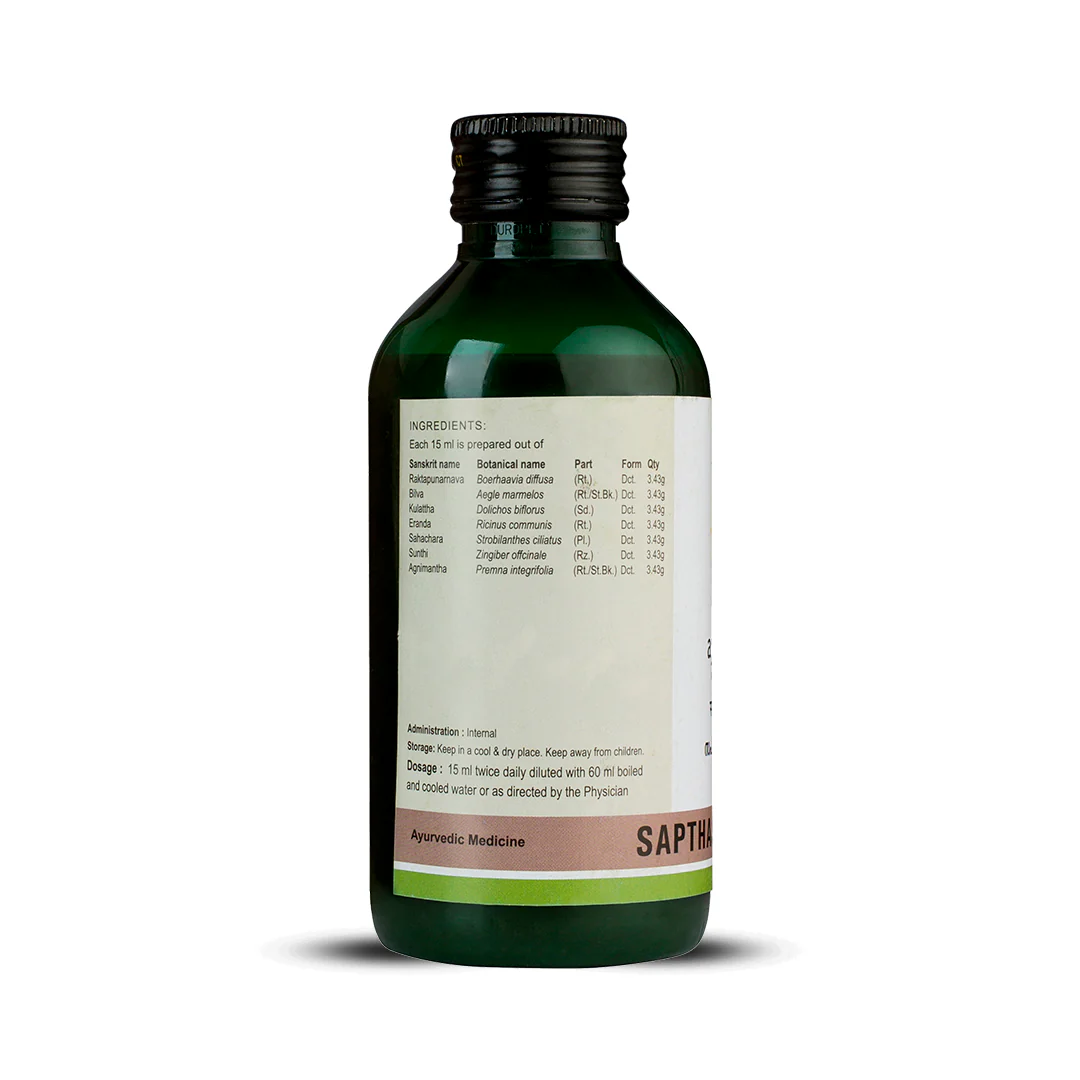 Sapthasaram Kwath is an Ayurvedic medicine used in the treatment of ascites, constipation, dyspareunia and other related conditions. It is made using seven Ayurvedic herbs and hence the name saptasaram. Kerala Ayurveda’s Sapthasaram Kwath is one of the prescriptions for treating stomach ache as well as spleen disorders. Hip pain Lower back pain Constipation Low digestion power Menstrual pain and painful periods Pain in the lower abdomen due to underlying organ pathology Ascites Dyspareunia (painful intercourse) Balancing Vata