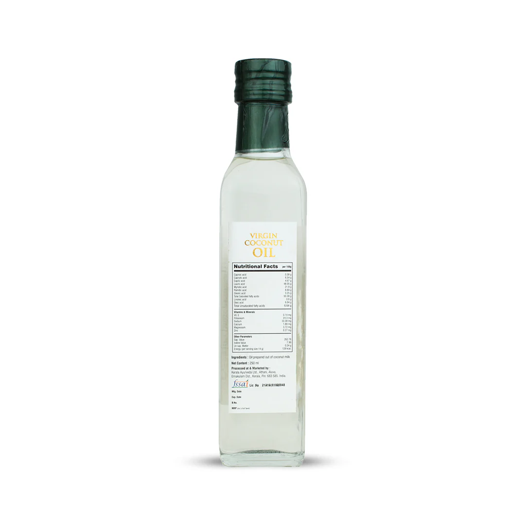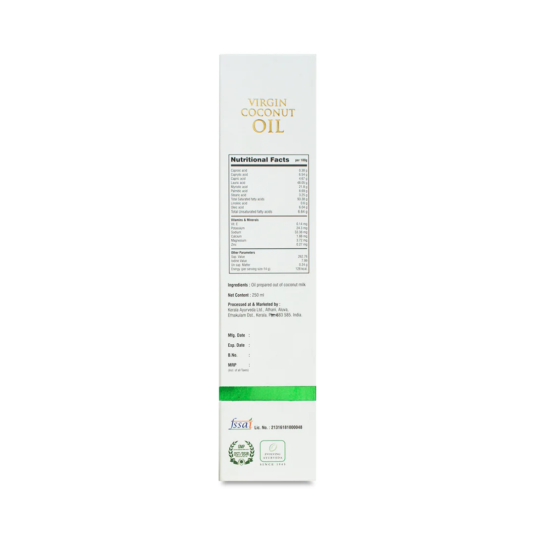 Kerala Ayurveda Virgin Coconut Oil is a pure, nutrient-rich, antioxidant-packed oil promoting skin and hair health, safe for consumption, and ideal for neonatal care. Strengthens and nourishes the hair Keep skin moisturized and firm Ideal for newborn baby massage. Used for cooking purpose