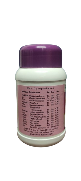 S.No Sanskrit Name Botanical Name Qty 1 Tugaksheeri Maranta arundinacca 0.099 g 2 Ela Elettaria cardamomum 0.198 g 3 Tvak Cinnamomum verum 0.198 g 4 Nagakesara Mesua ferrea 0.198 g 5 Patra Cinnamomum tamala 0.198 g 6 Yavani Trachyspermum roxburghianum 0.396 g 7 Dhanya Coriandrum sativum 0.396 g 8 Ajaji Cuminum cyminum 0.396 g 9 Grandhi Piper longum (wild var.) 0.396 g 10 Sunthi Zingiber officinale 0.396 g 11 Pippali Piper longum 0.396 g 12 Maricha Piper nigrum 0.396 g 13 Dadima Punica granatum 3.168 g 14 Sita Saccharum officinarum 3.168 g an="4">ach 10 gm prepared out of : S.No Sanskrit Name Botanical Name Qty 1 Tugaksheeri Maranta arundinacca 0.099 g 2 Ela Elettaria cardamomum 0.198 g 3 Tvak Cinnamomum verum 0.198 g 4 Nagakesara Mesua ferrea 0.198 g 5 Patra Cinnamomum tamala 0.198 g 6 Yavani Trachyspermum roxburghianum 0.396 g 7 Dhanya Coriandrum sativum 0.396 g 8 Ajaji Cuminum cyminum 0.396 g 9 Grandhi Piper longum (wild var.) 0.396 g 10 Sunthi Zingiber officinale 0.396 g 11 Pippali Piper longum 0.396 g 12 Maricha Piper nigrum 0.396 g 13 Dadima Punica granatum 3.168 g 14 Sita Saccharum officinarum 3.168 g