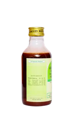 Each 10 ml prepared out of: S.No Sanskrit Name Botanical Name Qty SN Sanskrit name Botanical name Qty. 01 Guluchi Tinispora cordifolia 3.200 g 02 Padmaka Prunus cerasoides 3.200 g 03 Arishta Azadirachta indica 3.200 g 04 Dhanaka Coriandrum sativum 3.200 g 05 Raktachandana Pterocarpus santalinus 3.200 g