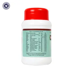 S.No Sanskrit Name Botanical Name Qty 1 Khanda Saccharum officinarum 6.000 g 2 Haridra Curcuma longa 0.960 g 3 Havisha Ghee 0.720 g 4 Kshira Milk 7.680 ml 5 Sunthi Zingiber officinale 0.120 g 6 Maricha Piper nigrum 0.120 g 7 Pippali Piper longum 0.120 g 8 Ela Elettaria cardamomum 0.120 g 9 Twak Cinnamomum verum 0.120 g 10 Patra Cinnamomum tamala 0.120 g 11 Krimighnam Embelia ribes 0.120 g 12 Trivrit Operculina turpethum 0.120 g 13 Haritaki Terminalia chebula 0.120 g 14 Vibhitaki Terminalia bellirica 0.120 g 15 Amalaki Phyllanthus emblica 0.120 g 16 Kesara Mesua ferrea 0.120 g 17 Musta Cyperus rotundus 0.120 g 18 Loham Iron 0.120 g
