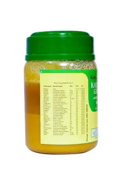 S.No Sanskrit Name Botanical Name Qty 1 Ghritam Ghee 12.723 ml 2 Haritaki Terminalia chebula 0.092 g 3 Amalaki Phyllanthus emblica 0.092 g 4 Vibhitaki Terminalia bellirica 0.092 g 5 Visala Citrullus colocynthis 0.092 g 6 Bhadraila Amomum subulatum 0.092 g 7 Devadaru Cedrus deodara 0.092g 8 Elavaluka Prunus avium 0.092 g 9 Sariba Hemidesmus indicus 0.092 g 10 Utpalasariba Ichnocarpus frutescens 0.092 g 11 Haridra Curcuma longa 0.092 g 12 Daruharidra Berberis aristata 0.092 g 13 Prisniparni Desmodium gangeticum 0.092 g 14 Salaparni Pseudarthria viscida 0.092 g 15 Phalini Callicarpa macrophylla 0.092 g 16 Nata Valeriana jatamansi 0.092 g 17 Brihati Solanum anguivi 0.092 g 18 Kushtha Saussurea costus 0.092 g 19 Manjishtha Rubia cordifolia 0.092 g 20 Nagakesara Mesua ferrea 0.092 g 21 Dadima Punica granatum 0.092 g 22 Vella Embelia ribes 0.092 g 23 Talisapatra Abies spectabilis 0.092 g 24 Ela Elettaria cardamomum 0.092 g 25 Malatimukula Jasminum grandiflorum 0.092 g 26 Utpala Kaempferia rotunda 0.092 g 27 Danti Baliospermum montanum 0.092 g 28 Padmaka Prunus cerasoides 0.092 g 29 Hima Santalum album 0.092 g