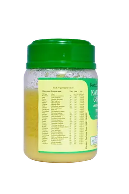 S.No Sanskrit Name Botanical Name Qty SL NO Sanskrit Name Botanical Name Qty 01 Ghritam Ghee 12.363 ml 02 Kantakari Solanum virginianum 11.636 g 03 Bala Sida cordifolia 0.026 g 04 Sunthi Zinziber officinale 0.026 g 05 Maricha Piper nigrum 0.026 g 06 Pippali Piper longum 0.026 g 07 Vidanga Embalia ribes 0.026 g 08 Sathi Hedychium spicatum 0.026 g 09 Dadima Punica granatum 0.026 g 10 Sauvarchala Sodii carbonas impura 0.026 g 11 Yavakshara Carbonate of potash 0.026 g 12 Mula Raphanus sativus 0.026 g 13 Amalaka Phyllanthus emblica 0.026 g 14 Paushkara Inula racemosa 0.026 g 15 Vrischiva Boerhavia verticillata 0.026 g 16 Brihati Solanum anguivi 0.026 g 17 Pathya Terminalia chebula 0.026 g 18 Yavani Cuminum cyminum 0.026 g 19 Chitraka Plumbago zeylanica 0.026 g 20 Riddhi Curculigo orchioides (sub.) 0.026 g 21 MriDvika Vitis vinifera 0.026 g 22 Chavya Piper mullesua 0.026 g 23 Varshabhu Boerhavia diffusa 0.026 g 24 Duralabha Tragia involucrata 0.026 g 25 Amlavetasa Garcinia pedunculata 0.026 g 26 Sringi Galls on Pistacia chinensis subsp. Integerrima+ 0.026 g 27 Tamalaki Phyllanthus amarus 0.026 g 28 Bharngi Rotheca serrata 0.026 g 29 Rasna Alpinia galanga 0.026 g 30 Gokshura Tribulus terrestris 0.026 g