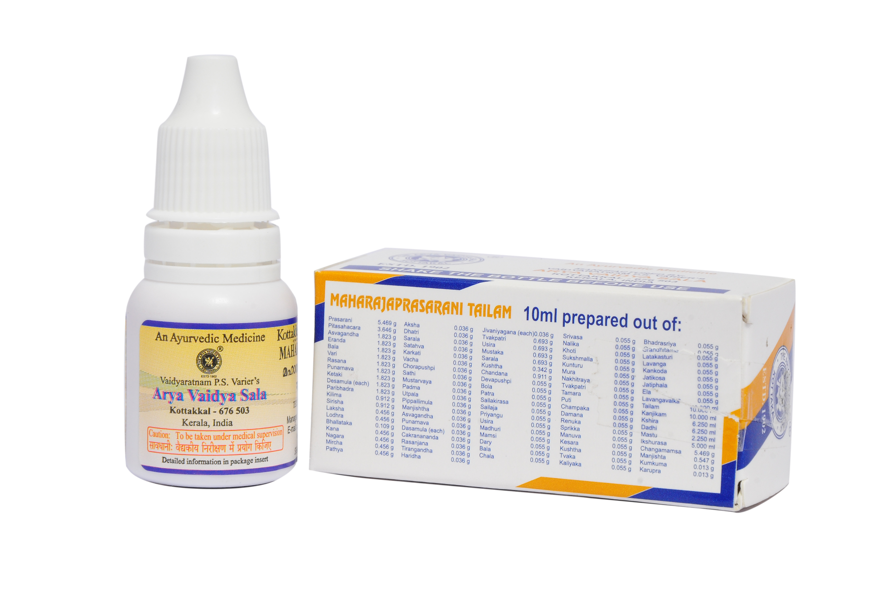 S.No Sanskrit Name Botanical Name Qty 01 Tailam Sesamum indicum 10.000 ml 02 Prasarani Merremia tridentata 5.469 g 03 Pitasahacara Barleria strigosa 3.646 g 04 Asvagandha Withania somnifera 1.823 g 05 Eranda Ricinus communis 1.823 g 06 Bala Sida cordifolia 1.823 g 07 Vari Asparagus racemosus 1.823 g 08 Rasna Alpinia galanga 1.823 g 09 Punarnava Boerhavia diffusa 1.823 g 10 Ketaki Pandanus odoratissimus 1.823 g 11 Vilva Aegle marmelos 1.823 g 12 Kasmari Gmelina arborea 1.823 g 13 Patala Stereospermum colais 1.823 g 14 Syonaka Oroxylum indicum 1.823 g 15 Agnimandha Premna corymbosa 1.823 g 16 Salaparni Pseudarthria viscida 1.823 g 17 Prisniparni Desmodium gangeticum 1.823 g 18 Brihati Solanum anguivi 1.823 g 19 Nidigdhika Solanum virginianum 1.823 g 20 Gokshura Tribulus terrestris 1.823 g 21 Paribhadra Erythrina variegata 1.823 g 22 Kilima Cedrus deodara 0.912 g 23 Sirisha Albizia lebbeck 0.912 g 24 Laksha Laccifer lacca 0.456 g 25 Lodhra Symplocos cochinchinensis var. laurina 0.456 g 26 Bhallataka Semecarpus anacardium 0.109 g 27 Kana Piper longum 0.109 g 28 Nagara Zingiber officinale 0.109 g 29 Maricha Piper nigrum 0.109 g 30 Pathya Terminalia chebula 0.036 g 31 Aksha Terminalia bellirica 0.036 g 32 Dhatri Phyllanthus emblica 0.036 g 33 Sarala Pinus roxburghii 0.036 g 34 Satahva Anethum graveolens 0.036 g 35 Karkati Galls on Pistacia chinensis subsp. Integerrima 0.036 g 36 Chorapushpi Costus speciosus 0.036 g 37 Musta Cyperus rotundus 0.036 g 38 Bhadramusta Cyperus esculentus 0.036 g 39 Padma Nelumbo nucifera 0.036 g 40 Utpala Monochoria vaginalis 0.036 g 41 Pippalimula Piper longum (wild var.) 0.036 g 42 Manjishtha Rubia cordifolia 0.036 g 43 Asvagandha Withania somnifera 0.036 g 44 Punarnava Boerhavia diffusa 0.036 g 45 Kashmari Gmelina arborea 0.036 g 46 Vilva Aegle marmelos 0.036 g 47 Patala Stereospermum tetragonum 0.036 g 48 Syonaka Oroxylum indicum 0.036 g 49 Agnimandha Premna corymbosa 0.036 g 52 Prisniparni Desmodium gangeticum 0.036 g 51 Salaparni Pseudarthria viscida 0.036 g 52 Brihati Solanum anguivi 0.036 g 53 Nidigdhika Solanum virginianum 0.036 g 54 Gokshura Tribulus terrestris 0.036 g 55 Cakramarda Cassia tora 0.036 g 56 Trinagandha Cymbopogon martinii 0.036 g 57 Haridra Curcuma longa 0.036 g 58 Jivanthi Leptadenia reticulata 0.036 g 59 Dvikakoli Withania somnifera (sub.) 0.072 g 60 Mudgaparni Dysolobium pilosum 0.036 g 61 Mashaparni Vigna radiata var. sublobata 0.036 g 62 Dvijivaka Pueraria tuberosa (sub.) 0.072 g 63 Madhuka Glycyrrhiza glabra 0.036 g 64 Tvakpatri Cinnamomum verum 0.693 g 65 Patraka Mesua ferrea 0.693 g 66 Usira Vetiveria zizanioides 0.693 g 67 Mustaka Cyperus rotundus 0.693 g 68 Sarala Pinus roxburghii 0.693 g 69 Kushta Saussurea costus 0.693 g 70 Chandana Santalum album 0.911 g 71 Devapushpi Syzygium aromaticum 0.055 g 72 Bola Commiphora myrrha 0.055 g 73 Patra Cinnamomum verum 0.055 g 74 Sailaja Asphaltum 0.055 g 75 Priyangu Callicarpa macrophylla 0.055 g 76 Usira Vetiveria zizanioides 0.055 g 77 Madhuri Anethum graveolens 0.055 g 78 Daru Cedrus deodara 0.055 g 79 Bala Sida cordifolia 0.055 g 80 Chala Boswellia serrata 0.055 g 81 Srivasa Pinus roxburghii 0.055 g 82 Nalika Cymbopogon martinii 0.110 g 83 Sukshmaila Elettaria cardamomum 0.055 g 84 Kunturu Boswellia serrata 0.055 g 85 Nakhitraya Helix aspera 0.055 g 86 Tvakpatri Cinnamomum verum 0.055 g 87 Pamara Tinospora cordifolia 0.055 g 88 Puti Sterculia foetida 0.055 g 89 Champaka Magnolia champaca 0.055 g 90 Damana Artemisia nilagirica 0.055 g 91 Renuka Piper cubeba 0.055 g 92 Sprikka Schizachyrum exile 0.055 g 93 Maruva Ocimum kilimandscharicum 0.055 g 94 Musta Cyperus rotundus 0.055 g 95 Kesara Mesua ferrea 0.055 g 96 Tvak Cinnamomum verum 0.055 g 97 Bhadrasriya Santalum album 0.055 g 98 Latakasturi Curcuma longa 0.055 g 99 Lavanga Syzygium aromaticum 0.055 g 100 Kankola Illicium verum 0.055 g 101 Jatikosa Myristica fragrans (Mace) 0.055 g 102 Jatiphala Myristica fragrans (Nutmeg) 0.055 g 103 Ela Elettaria cardamomum 0.055 g 104 Lavangavalka Cinnamomum verum 0.055 g 105 Kanchikam Sour gruel 10.000 ml 106 Kshira Cow’s milk 6.250 ml 107 Dadhi Curd 6.250 ml 108 Mastu Whey 2.250 ml 109 Ikshurasa Saccharum officinarum 5.000 ml 110 Chagamamsa Goat’s meat 5.469 g 111 Manjishta Rubia cordifolia 0.547 g 112 Kunkuma Crocus sativus 0.013 g 113 Karpura Cinnamomum camphora 0.013 g