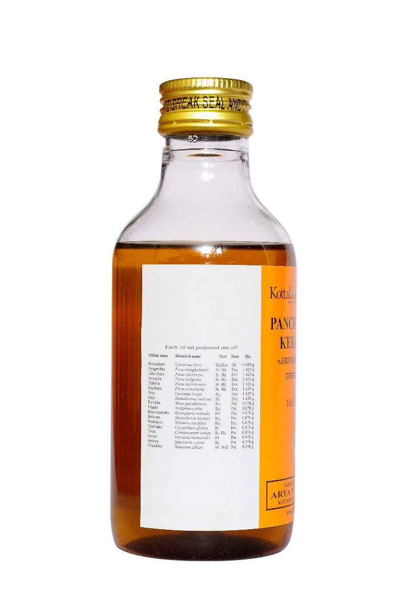 SN Official Name Botanical Name/ English Name Qty. 01 Kera Tailam Cocos nucifera 10.000 ml 02 Nyagrodha Ficus benghalensis 1.429 g 03 Udumbara Ficus racemosa 1.429 g 04 Aswatha Ficus religiosa 1.429 g 05 Plaksha Ficus microcarpa 1.429 g 06 Kapitana Ficus arnottiana 1.429 g 07 Nisa Curcuma longa 1.429 g 08 Gopi Hemidesmus indicus 1.429 g 09 Rambha Musa paradisiaca 0.078 g 10 Utpala Nymphaea alba 0.078 g 11 Bhuchambaka Kaempferia rotunda 0.078 g 12 Indivara Monochoria vaginalis 0.078 g 13 Pankajam Nelumbo nucifera 0.078 g 14 Madhuka Glycyrrhiza glabra 0.078 g 15 Tvak Cinnamomum verum 0.078 g 16 Savya Vetiveria zizanioides 0.078 g 17 Amaya Saussurea costus 0.078 g 18 Chandana Santalum album 0.078 g