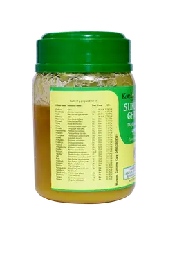 S.No Sanskrit Name Botanical Name Qty 1 Ghritam Ghee 7.757 ml 2 Erandataila Ricinus communis 4.121 ml 3 Guda Saccharum officinarum 3.636 g 4 Paya Milk 7.757 ml 5 Punarnava Boerhavia diffusa 12.121 g 6 Kasmari Gmelina arborea 1.212 g 7 Vilva Aegle marmelos 1.212 g 8 Patala Stereospermum colais 1.212 g 9 Syonaka Oroxylum indicum 1.212 g 10 Agnimandha Premna corymbosa 1.212 g 11 Salaparni Pseudarthria viscida 1.212 g 12 Prisniparni Desmodium gangeticum 1.212 g 13 Brihati Solanum anguivi 1.212 g 14 Nidigdhika Solanum virginianum 1.212 g 15 Gokshura Tribulus terrestris 1.212 g 16 Payasya Leptadenia reticulata 1.212 g 17 Aswagandha Withania somnifera 1.212 g 18 Eranda Ricinus communis 1.212 g 19 Satavari Asparagus racemosus 1.212 g 20 Darbha Desmostachya bipinnata 2.424 g 21 Sara Saccharum arundinaceum 1.212 g 22 Kasa Saccharum spontaneum 1.212 g 23 Iksumula Saccharum officinarum 1.212 g 24 Potagala Typha elephantina 1.212 g 25 Krishna Piper longum 0.242 g 26 Krishnamula Piper longum (wild var.) 0.242 g 27 Saindhava Rock salt 0.242 g 28 Yashtimadhu Glycyrrhiza glabra 0.242 g 29 Mridvika Vitis vinifera 0.242 g 30 Yavani Ciminum cyminum 0.242 g 31 Nagara Zingiber officinale 0.242 g