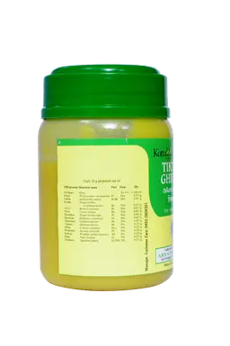 S.No Sanskrit Name Botanical Name Qty 1 Ghritam Ghee 11.826 ml 2 Patola Trichosanthes cucumerina 0.927 g 3 Nimba Azadirachta indica 0.927 g 4 Katuka Neopicrorhiza scrophulariiflora 0.927 g 5 Darvi Berberis aristata 0.927 g 6 Patha Cyclea peltata 0.927 g 7 Duralabha Tragia involucrata 0.927 g 8 Parpataka Oldenlandia corymbosa 0.927 g 9 Trayamana Gentiana kurroo 0.927 g 10 Trayanti Gentiana kurroo 0.231 g 11 Musta Cyperus rotundus 0.231 g 12 Bhunimba Swertia chirayita 0.231 g 13 Kalinga Holarrhena pubescens 0.231 g 14 Kana Piper longum 0.231 g 15 Chandana Santalum album 0.231 g