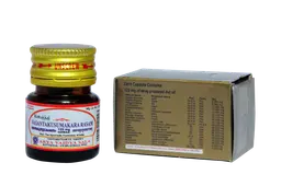 1 Hatakabhasma Gold 8.065 mg 2 Rajatabhasma Silver 8.065 mg 3 Vangabhasma Tin 12.097 mg 4 Ahibhasma Lead 12.097 mg 5 Kantakabhasma Iron 12.097 mg 6 Suta Mercury 16.129 mg 7 Abhrabhasma Mica 16.129 mg 8 Pravalabhasma Coral 16.129 mg 9 Mauktikabhasma Pearl 16.129 mg 10 Gavyadugdha Cow's milk 40.322 mg 11 Ikshu Saccharum officinarum 40.322 mg 12 Vasa Justicia adhatoda 40.322 mg 13 Laksha Laccifer lacca 40.322 mg 14 Udichya Plectranthus vettiveroides 40.322 mg 15 Rambhakanda Musa paradisiaca 40.322 mg 16 Satapatrika Rosa centifolia 40.322 mg 17 Malati Jasminum grandiflorum 40.322 mg 18 Kankolam Piper cubeba 4.032 mg 19 Kunkuma Crocus sativus 4.032 mg