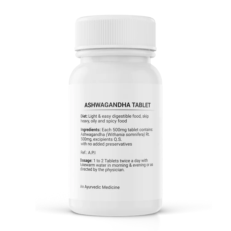 Dosage: 1 to 2g twice a day with warm water in morning & evening or as directed by the physician Foods to Avoid: Heavy, Oily & Spicy food. Diet: Light & easy to digest food Ashwagandha tablets are a popular Ayurvedic supplement derived from the Ashwagandha plant (Withania somnifera), also known as Indian ginseng or winter cherry. Ashwagandha tablet benefits include its ability to help increase muscle strength, boost body immunity, and reduce fatigue. In addition, Ashwagandha tablet from the plant's root helps the body cope with stress.