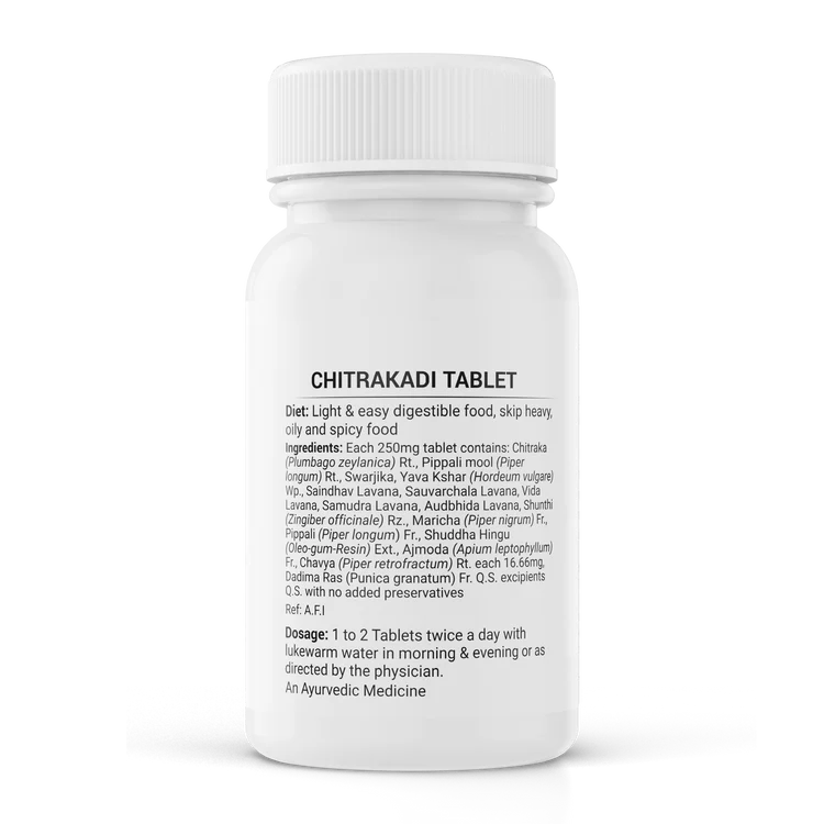 Chitrakadi Vati: Chitrakadi Vati is a classical Ayurvedic herbal formulation used in traditional medicine. It is composed of a combination of herbs and spices, with Chitraka (Plumbago zeylanica) being the primary ingredient. The formulation also typically includes other ingredients such as ginger (Zingiber officinale), black pepper (Piper nigrum), Pippali (Piper longum) and Saindhav Lavana. Chitrakadi Vati is known for its digestive properties and is primarily used to stimulate the digestive fire, improve digestion and alleviate digestive issues such as indigestion, bloating, gas and poor appetite. It is believed to have metabolism-boosting properties, which may aid in weight management by enhancing the body's natural fat-burning processes.