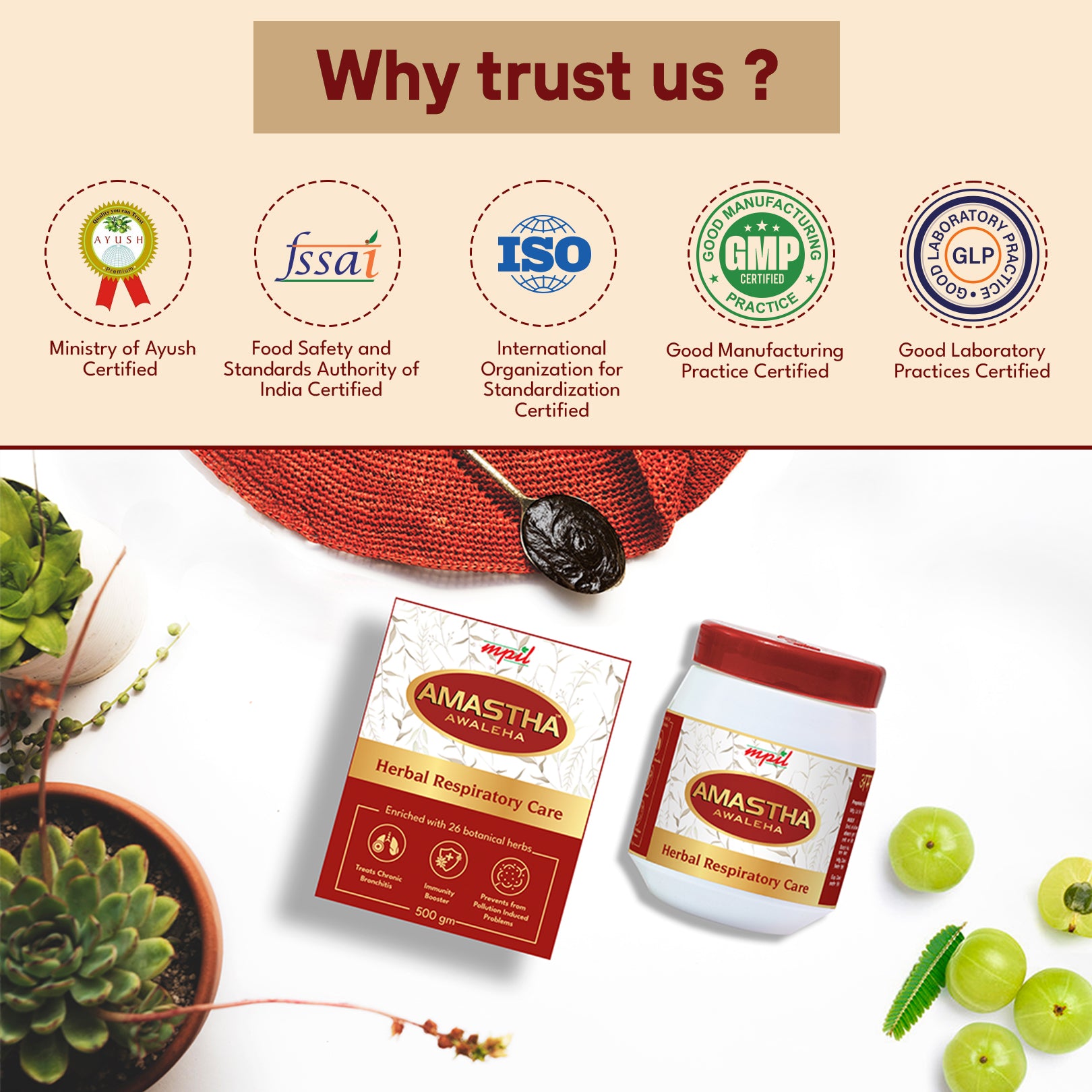 MPIL Amastha Awaleha is an Ayurvedic herbal formulation designed to support respiratory health and act as an immunity booster. It is a semisolid paste (Avaleha) and is approved by the Ministry of Ayush. Key Benefits & Uses Mpil Amastha Awaleha is primarily used as a respiratory rejuvenator for various conditions: Respiratory Support: It helps in managing symptoms associated with asthma, chronic bronchitis, and cough (both wet and dry). Inflammation Reduction: It helps prevent inflammation of the mucous membrane in the bronchial tubes and reduces bronchial spasms. Mucus Expulsion: The formulation acts as an effective expectorant and has a mucolytic effect, facilitating the expulsion of mucus and clearing airways. Symptom Relief: It can reduce the intensity and frequency of cough attacks, relieve throat and nasal irritation, and help with shortness of breath. Immunity Boosting: Described as a natural source of Vitamin C and rich in antioxidants from ingredients like Amla, it helps enhance the body's natural defense mechanism.