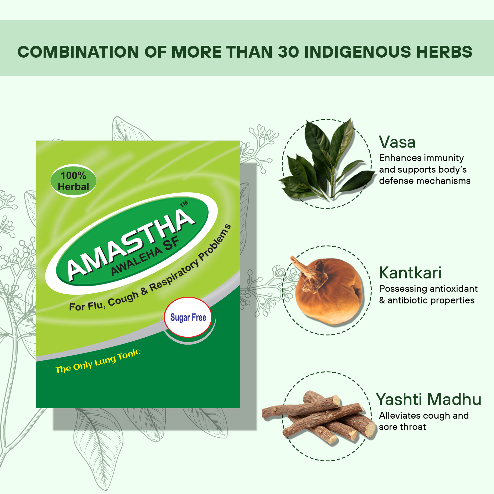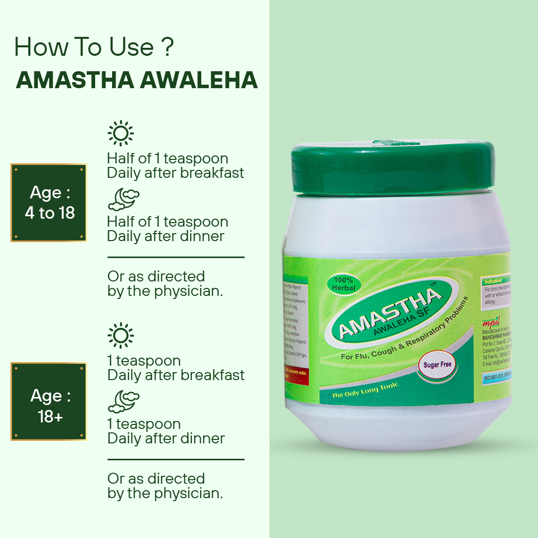 MPIL Amastha Awaleha SF is a sugar-free Ayurvedic herbal paste from Maheshwari Pharmaceuticals Ltd. that supports respiratory health and boosts immunity. It is used to relieve cold, cough, and congestion, strengthen the respiratory system, and help with breathing difficulties. The product is an all-natural, vegetarian paste made from a blend of over 30 indigenous herbs, and it is suitable for diabetics. What it is Product: An Ayurvedic herbal paste, specifically a sugar-free version of Amastha Awaleha. Manufacturer: MPIL (Maheshwari Pharmaceuticals Ltd.). Dietary information: Vegetarian. Key benefits: Respiratory relief: Helps with cough, congestion, and breathing difficulties. Immunity support: Strengthens the body's natural defense mechanisms against respiratory issues. Bronchial comfort: Supports healthy respiratory function and clear airways. Antioxidant protection: Contains herbs that provide antioxidant benefits. Key ingredients: A blend of over 30 herbs, including Vasa, Kantakari, Yastimadhu, Giloy, and Khajoor. Shelf life: Up to 36 months.