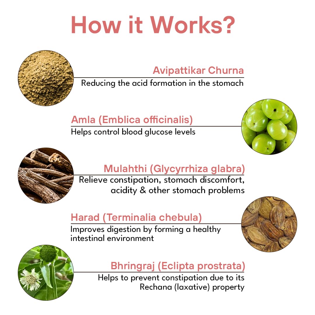 The tablets are a powerful Ayurvedic formulation, with the main ingredients including: Avipattikar Churna: Neutralizes excess stomach acid and helps relieve bloating. Emblica officinalis (Amla): Balances stomach acid and supports healthy metabolism. Glycyrrhiza glabra (Mulaithi): Soothes the digestive tract and stomach lining, relieving acidity and discomfort. Swarjikshar: Helps in balancing stomach acidity. Harad (Terminalia chebula): Enhances digestion and supports healthy bowel movements. Dosage and Safety The recommended dosage is 2 tablets twice a day with water or as directed by a physician. MPIL claims the tablets have no side effects, making them suitable for regular use. Important Information: Pregnant individuals must consult their physician before use.