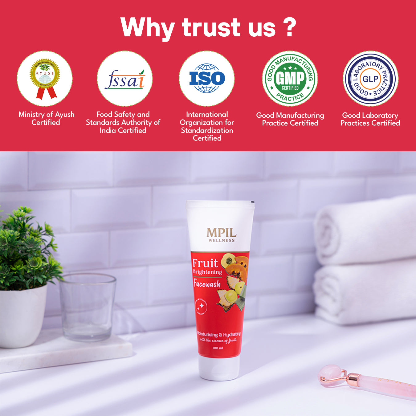 The Mpil Wellness Fruit Brightening Face Wash is a gentle, gel-based cleanser enriched with natural fruit extracts and is designed to brighten the skin, remove impurities, and provide hydration. It is suitable for all skin types. Key Ingredients & Benefits The face wash contains a blend of natural ingredients known for their skin-nourishing properties: Papaya Extract: Contains the natural enzyme papain, which helps gently exfoliate the skin by removing dead skin cells and unclogging pores to promote a smoother complexion. Pineapple Extract: Works with papaya to help brighten the skin tone and fade the appearance of dark spots or hyperpigmentation. Aloe Vera Extract: Known for its hydrating, moisturizing, and anti-inflammatory properties, it helps to calm irritated skin and lock in moisture. Amla Extract: Packed with vitamins and nutrients that nourish the skin and support a healthy, youthful appearance. Vitamin E and Glycerin: Provide additional hydration and antioxidant protection from free radicals, which contribute to premature aging.