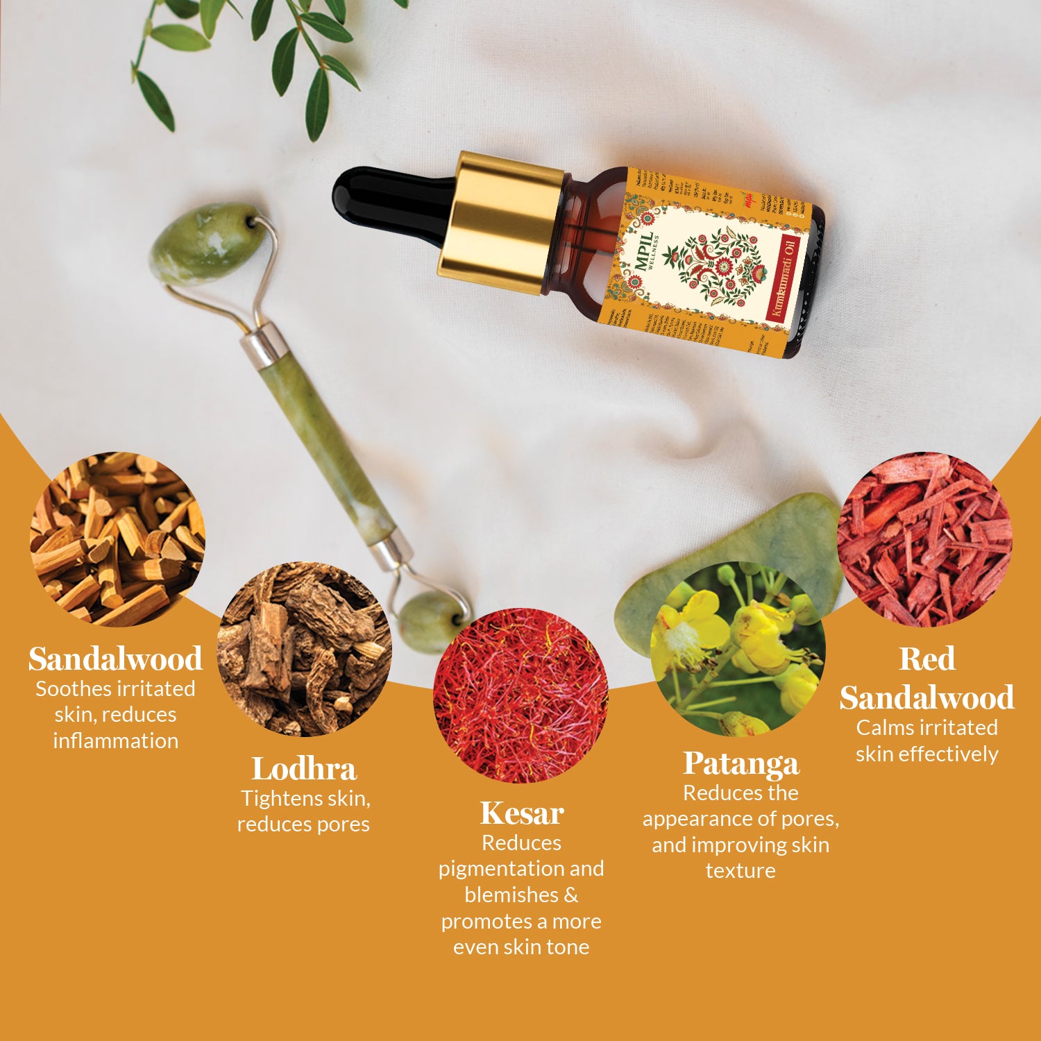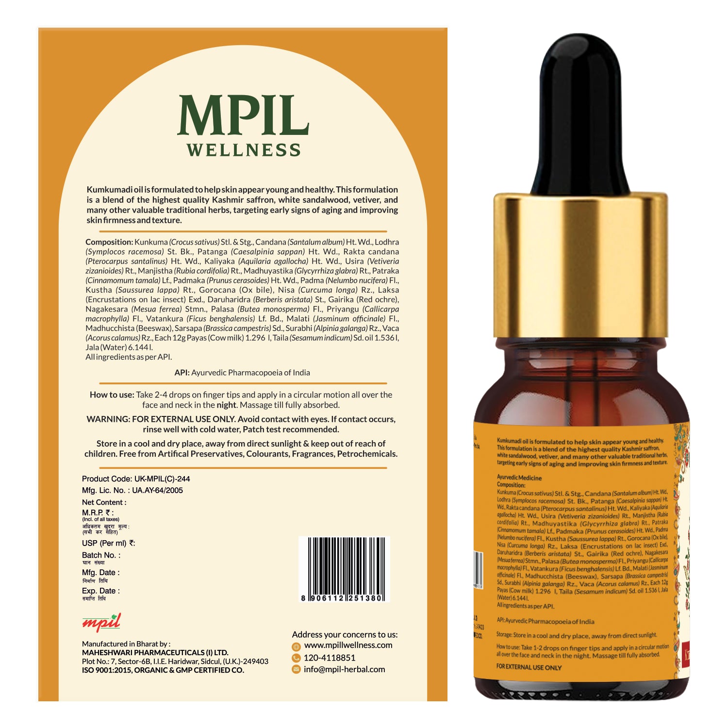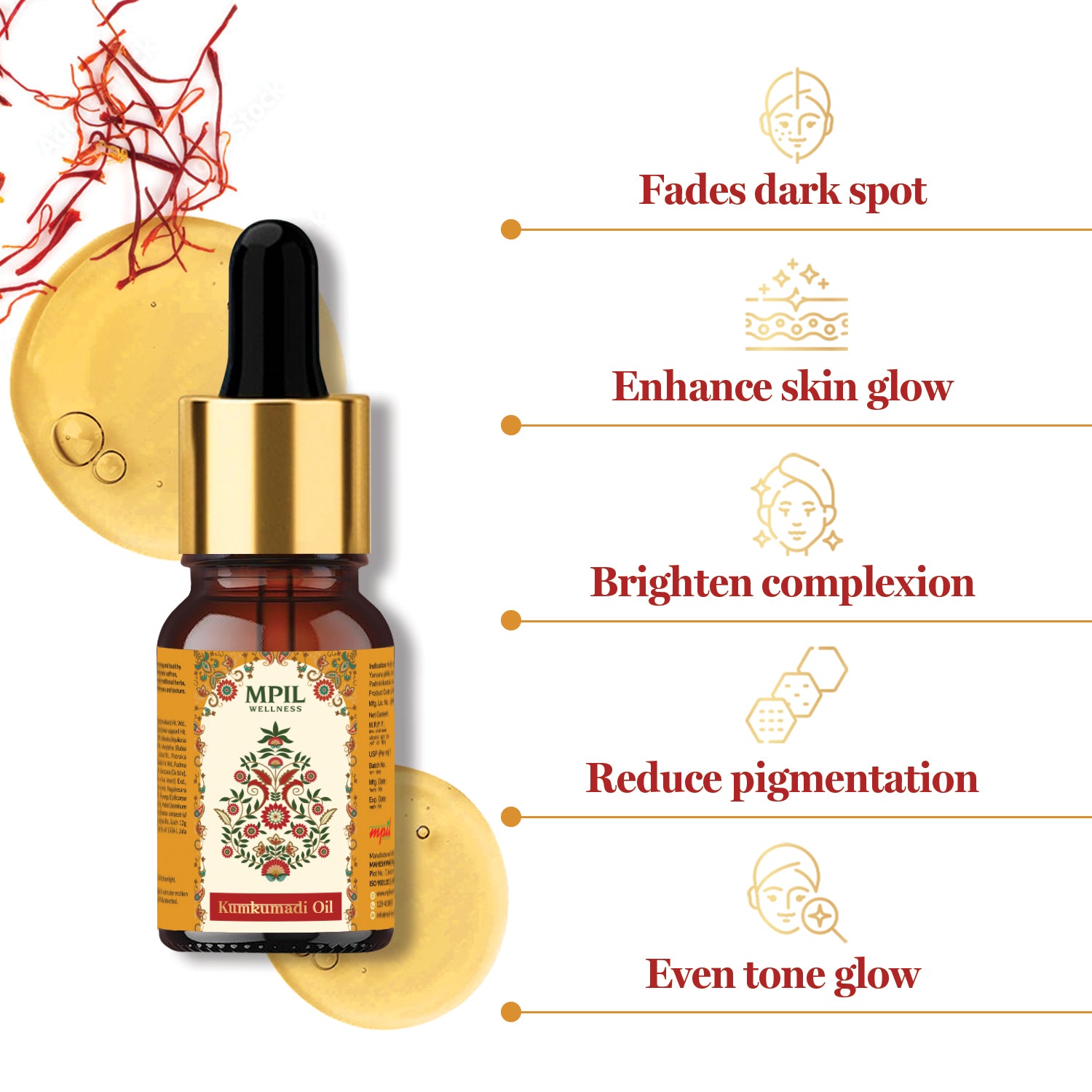 MPIL Kumkumadi Oil is a traditional Ayurvedic facial oil formulated with ingredients like saffron, sandalwood, and vetiver to help brighten the complexion, reduce pigmentation, and provide a radiant glow. It is suitable for all skin types and is typically used as a night treatment. Key Benefits & Features Skin Brightening: The oil is designed to lighten skin tone and improve overall brightness, thanks to key ingredients like Kashmiri saffron. Reduces Pigmentation: Regular use may help in reducing the appearance of dark spots, blemishes, and hyperpigmentation. Anti-aging Support: The antioxidants in the oil help to manage early signs of aging, such as fine lines and wrinkles, promoting a more youthful and firm appearance. Deep Hydration: It provides intense moisturization, leaving the skin soft, supple, and nourished. Natural Formulation: It is a traditional Ayurvedic recipe enriched with a blend of natural herbs and free from artificial chemicals and fragrances.