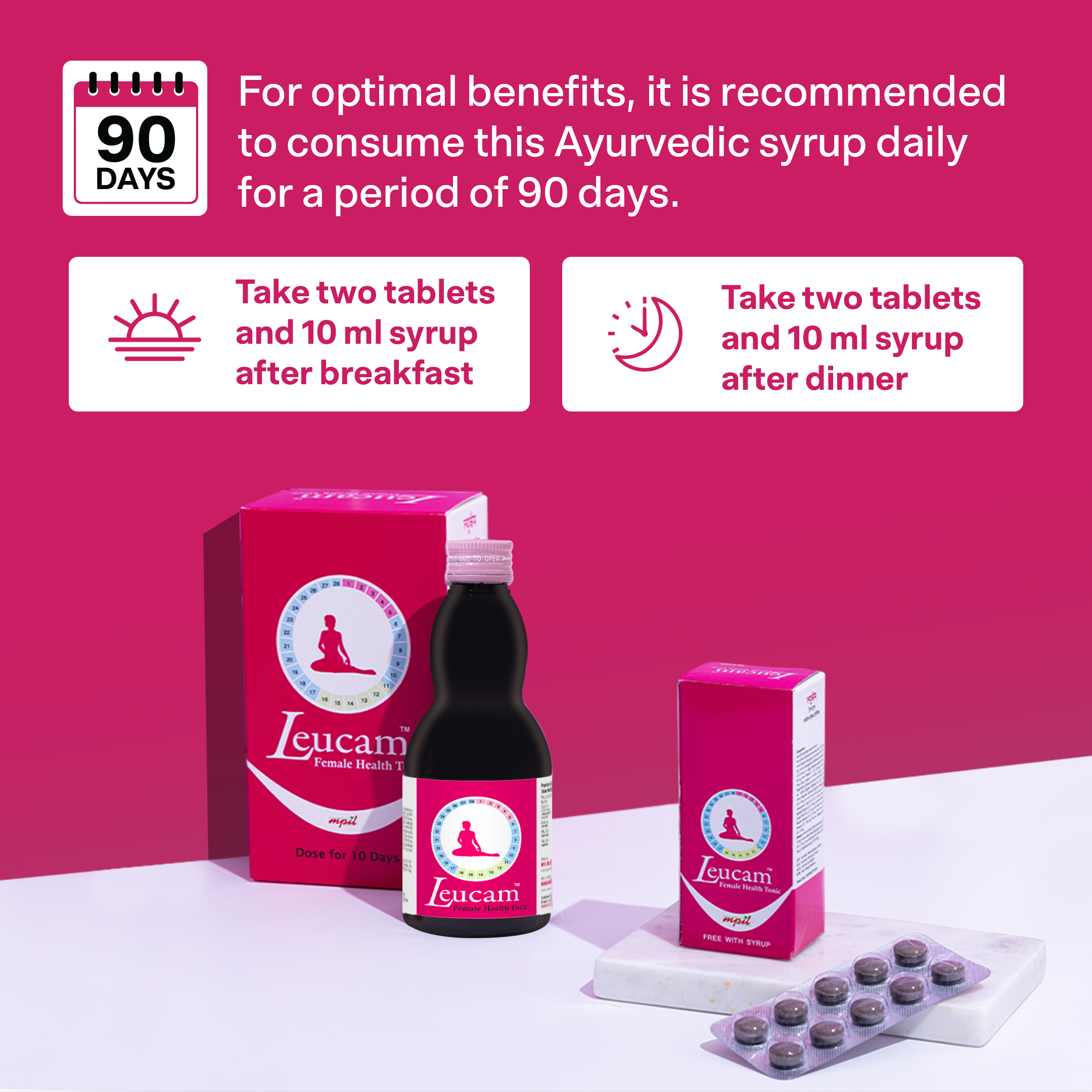MPIL Leucam (combipack) is an Ayurvedic women's health supplement that includes a syrup and tablets, designed to help with menstrual health and conditions like PCOD/PCOS. Key ingredients include Ashok Chhal, Lodhra, Shatavari, and Dashmool, and it aims to promote hormonal balance, regulate periods, and relieve associated discomfort. The typical dosage is \(10\) ml of syrup with \(2\) tablets, twice a day. What it is Product: A combipack of an Ayurvedic women's health supplement.Components: A \(200\) ml syrup and \(40\) tablets.Purpose: To support women's health by addressing issues such as PCOD/PCOS symptoms, urinary tract infections (UTIs), irregular periods, and hormonal imbalances.Â