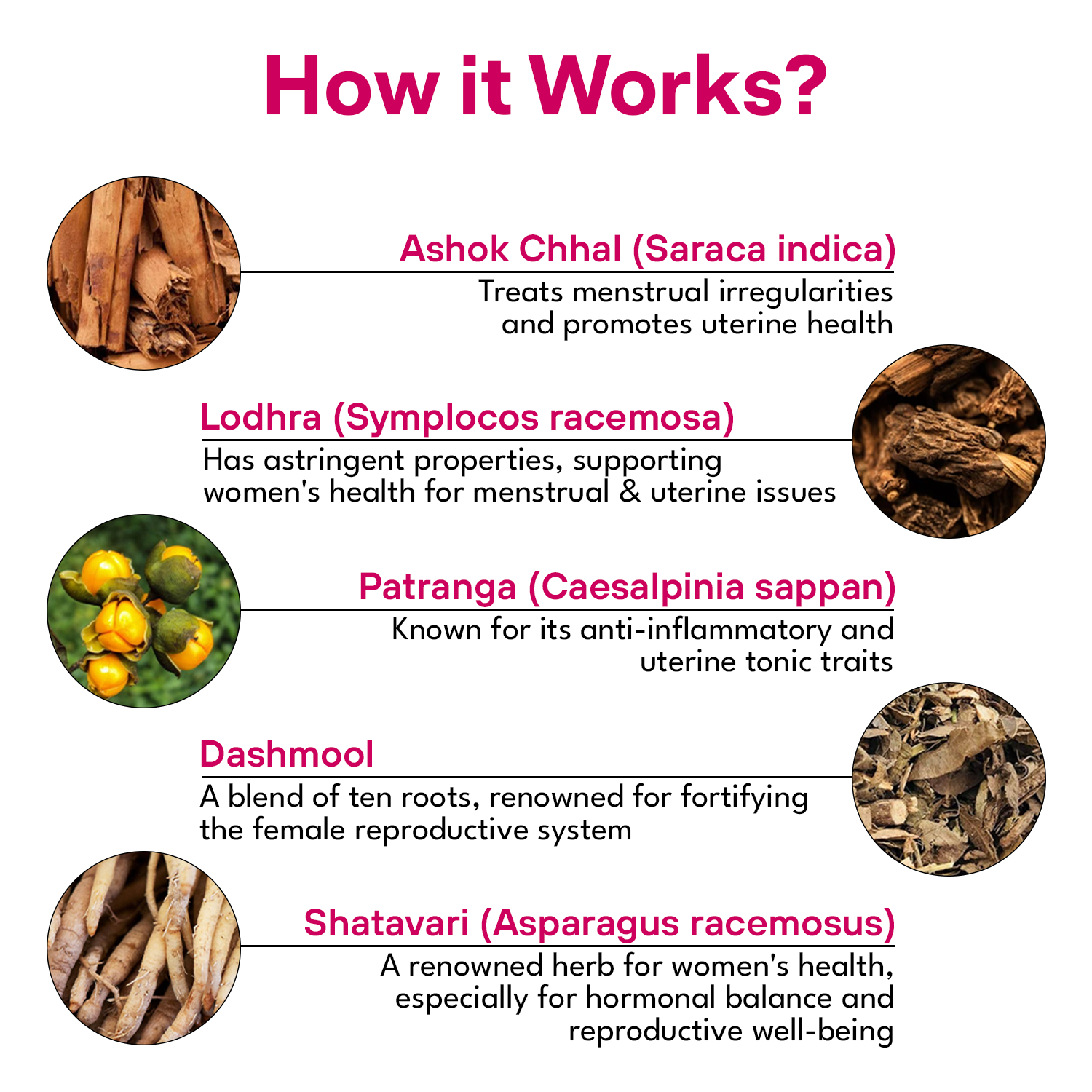 Key ingredients Ashok ChhalLodhraPatrangShatavariDashmool Potential benefits Promotes hormonal balanceEases menstrual discomfort and crampsRegulates irregular periodsHelps manage PCOS symptomsSupports overall reproductive healthMay help manage menopause symptoms Dosage A typical recommended dosage is \(10\) ml of syrup with \(2\) tablets, twice a day, as per the directions on the package or by a healthcare professional.One source recommends a \(10\) day course at this dosage, while others suggest it is for long-term wellness.Always follow the specific instructions provided with the product. Important considerations This information is not medical advice.Always consult with a healthcare professional before starting any new supplement.Some sources list a different combipack size (e.g., \(400\) ml syrup and \(80\) tablets), so check the specific product you are purchasing.Â