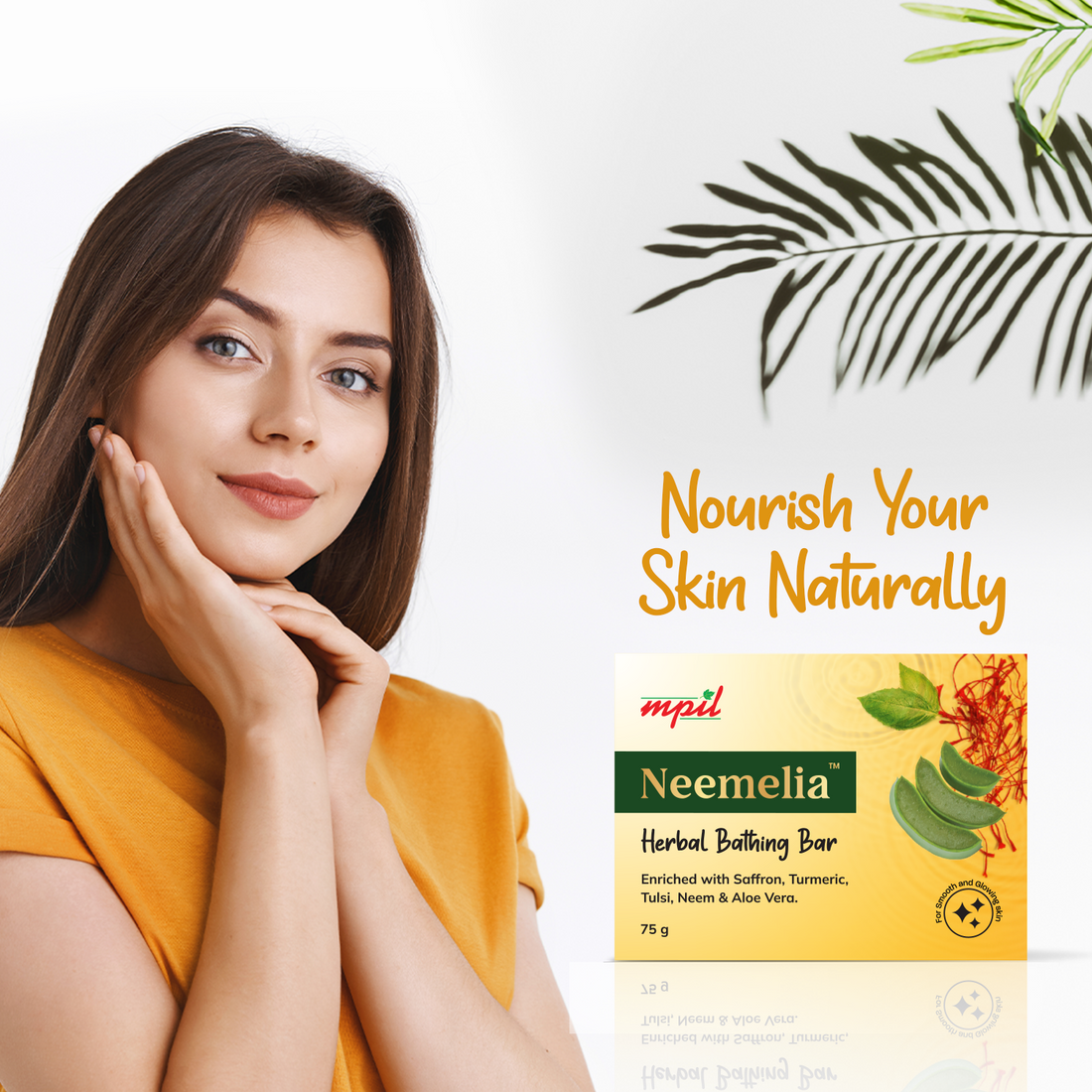 The MPIL Neemelia Soap (formally known as the MPIL Neemelia Herbal Bathing Bar) is an anti-allergic, paraben-free herbal soap enriched with neem, saffron, turmeric, tulsi, and aloe vera designed to cleanse, nourish, and protect the skin. Key Benefits Anti-bacterial and Anti-fungal Action: Possesses properties that help prevent skin infections, breakouts, acne, and conditions like eczema and psoriasis. Deep Cleansing and Rejuvenation: Effectively removes dirt, oil, and impurities, leaving the skin feeling refreshed. Moisturization: Keeps the skin hydrated, preventing dryness due to the addition of ingredients like glycerin and coconut oil. Complexion Enhancement: Aids in improving skin tone and complexion, enhancing glow and radiance. Soothing Properties: Helps alleviate skin allergies, irritation, and itching.