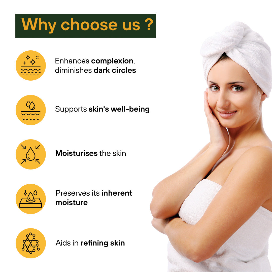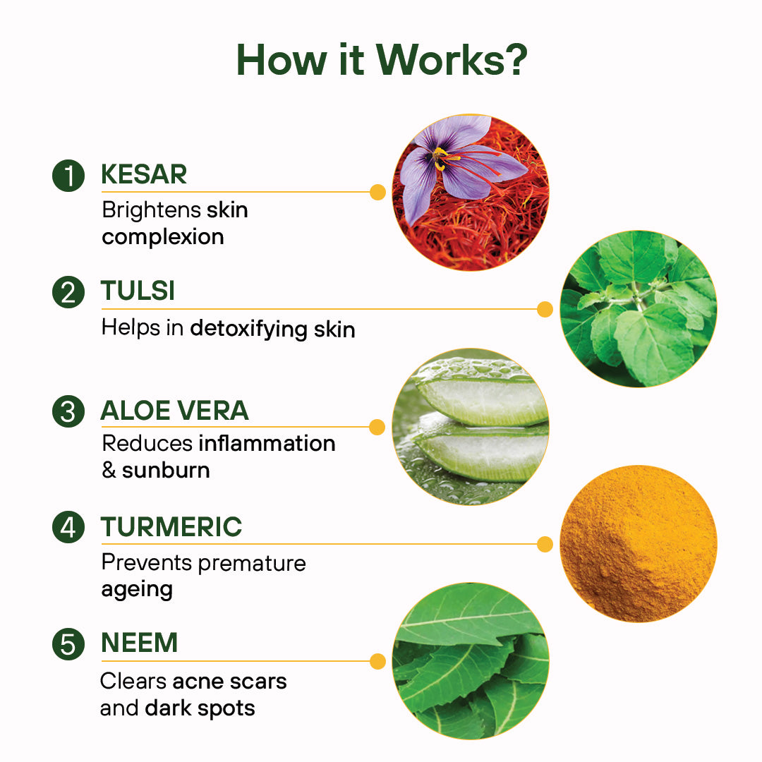 The soap features a blend of natural extracts in a soap base: Neem Extract (Azadirachta indica): Known for clearing acne scars and providing anti-bacterial action. Saffron Extract (Crocus sativus): Helps brighten skin complexion and improve skin tone. Turmeric Extract (Curcuma longa): Provides natural anti-inflammatory properties to soothe the skin. Tulsi Extract (Ocimum tenuiflorum): Aids in detoxifying the skin. Aloe Vera Extract (Aloe barbadensis): Reduces inflammation and helps with sunburn. Coconut Oil & Glycerin: Help retain moisture in the skin.