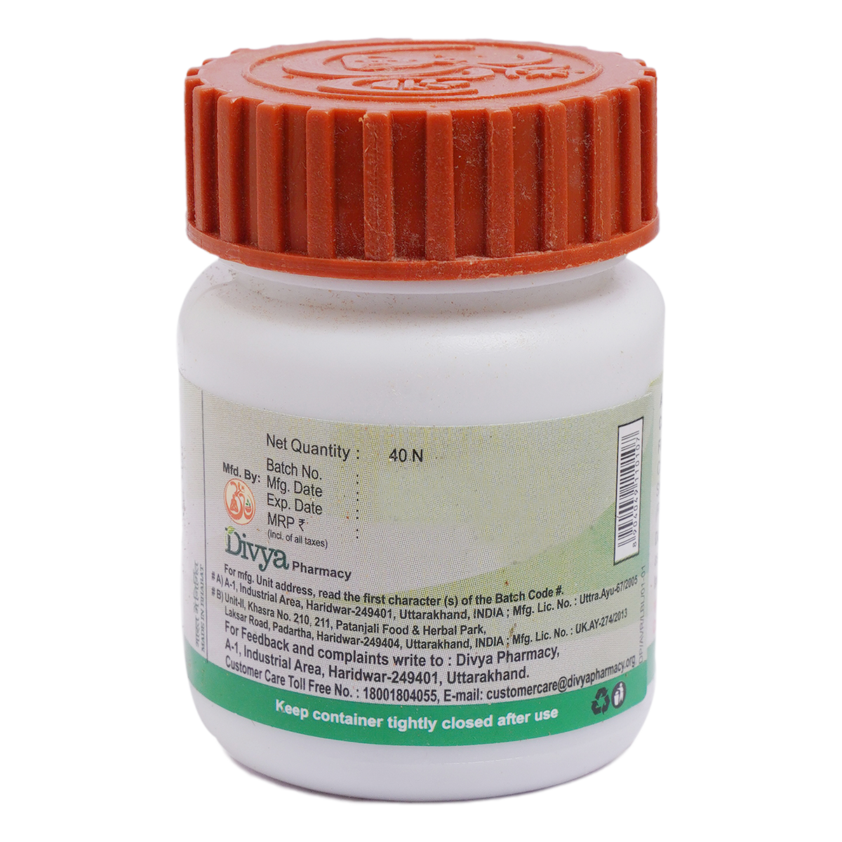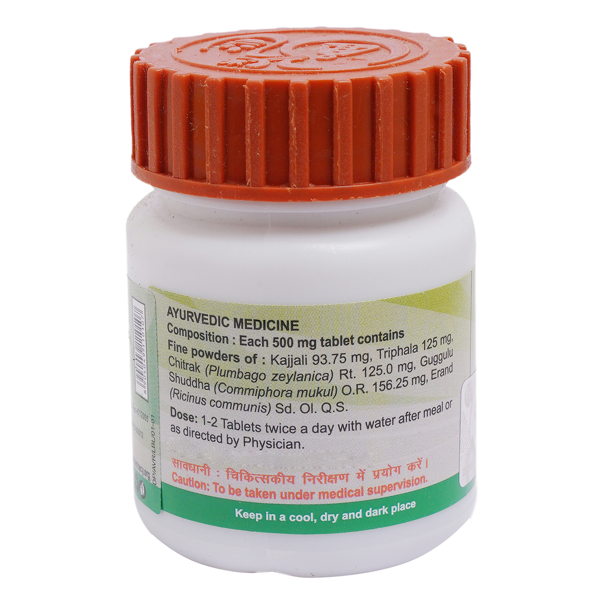 Light to dark grey colour, round biconvex film coated tablet with characteristic odour taste. Shuddha Parad, Shuddha gandhak, Triphala,Chitrak, Guggulu shuddha, Erand. To be taken under medical supervision. 1-2 Tablets twice daily with lukewarm water or as directed by the physician.