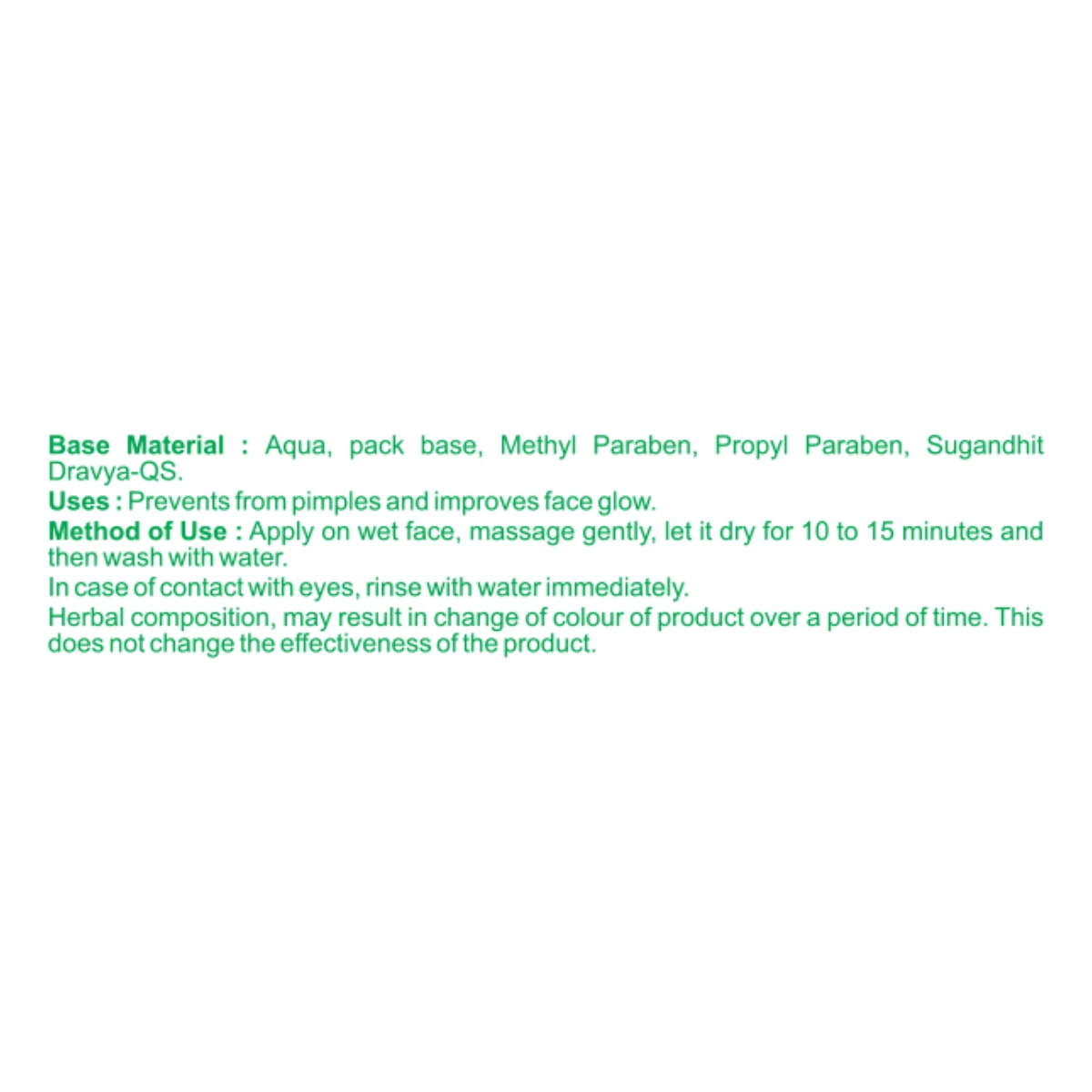 Apply a layer on wet face. Let it dry for 10 to 15 minutes and then wash with water Herbal composition may result in change of colour of product over a period of time. This does not change the effectiveness of the product.