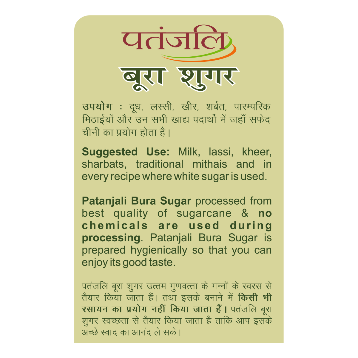Patanjali bura sugar processed from best quality of sugarcane and no chemicals are used during processing. Patanjali Bura sugar is prepared hygienically so that you can enjoy its good taste.