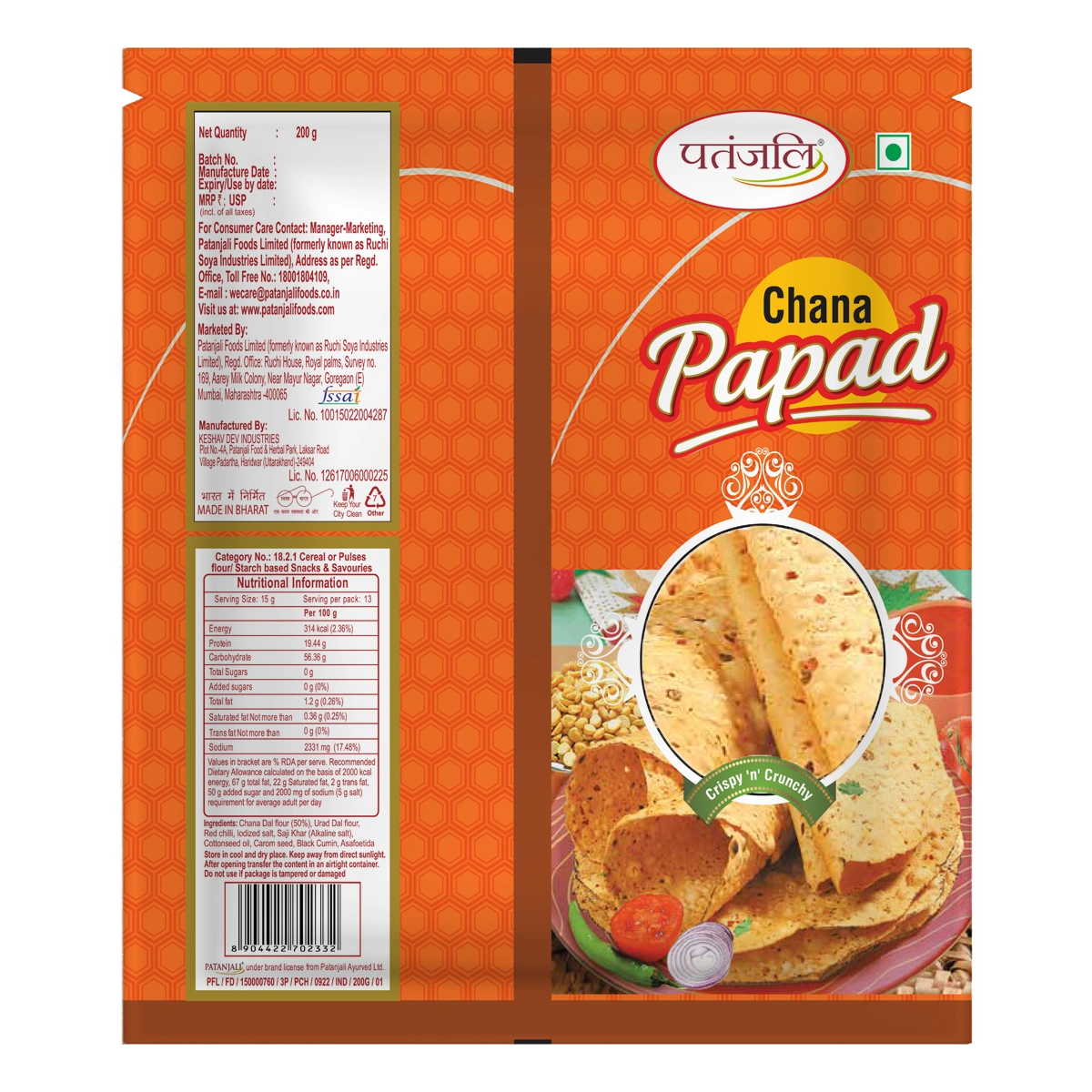 Patanjali Chana dal papad is a traditional Indian thin, crisp, disc-shaped spicy treat made from flours and Chana dal. It can be served as an accompaniment to a meal. As the name suggests, patanjali papad is rich in Chana dal content.