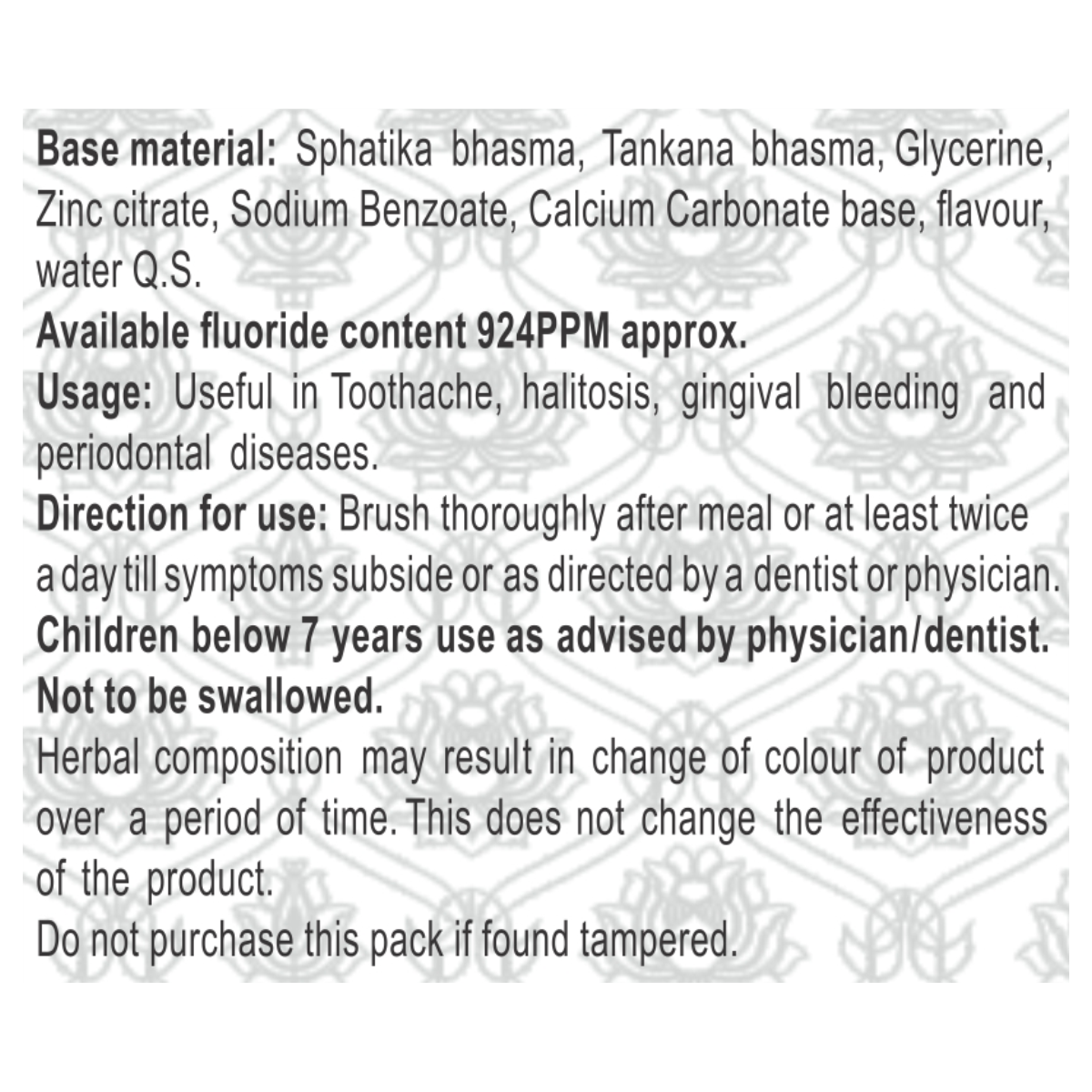 Useful in toothache, halitosis, gingival bleeding and periodontal diseases. Brush at least twice a day till symptoms subside or as directed by a dentist or physician.