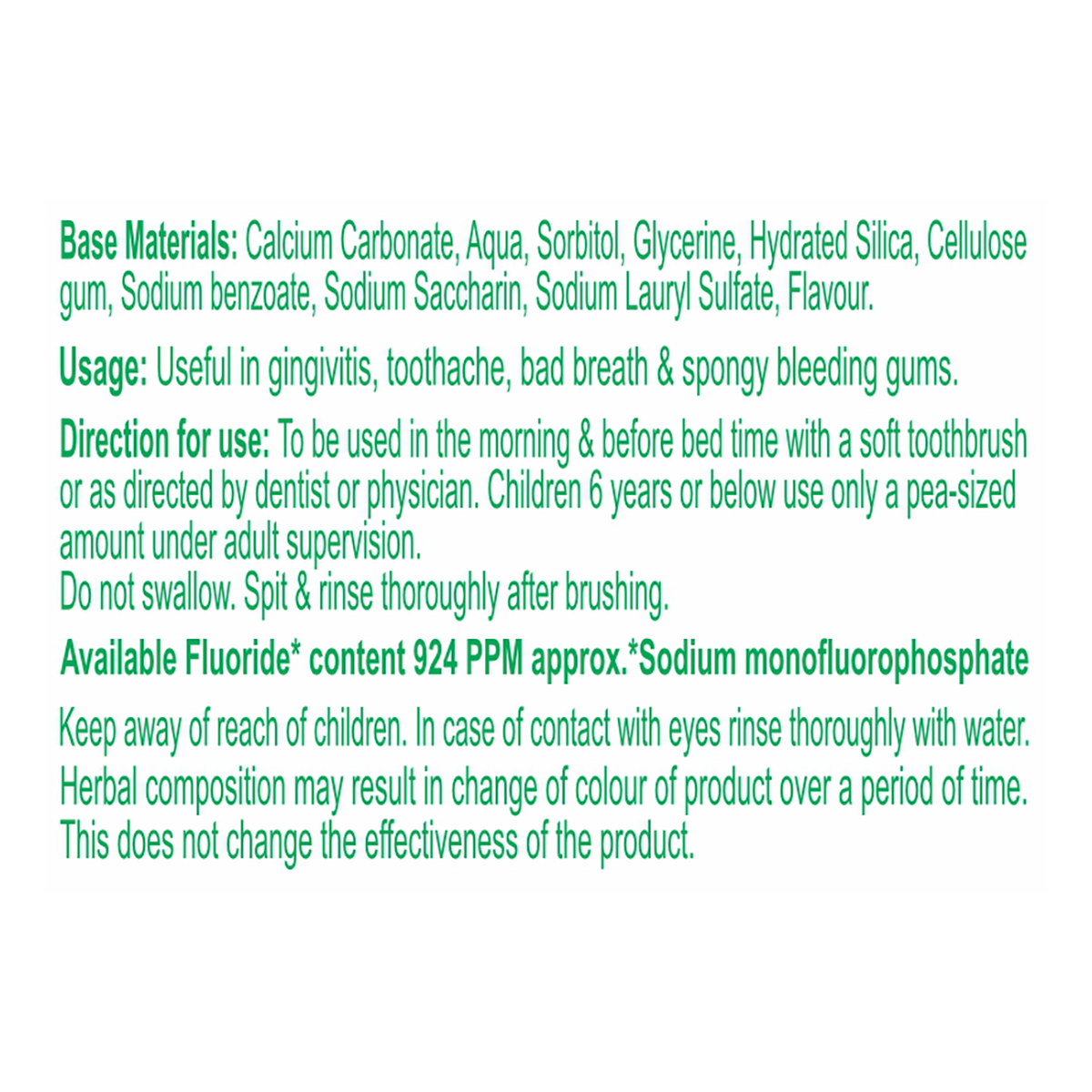 From offering dental protection to dental beauty, it works to guard and beautify your teeth. Packed with the goodness of nature. Akarkara and babul protect the gums, neem, timbaru, turmeric and cloves remove and offer protection from bacteria, pudhina and pipli refresh the gums, peelu and maju phal make gums stronger. Dental problems such as pyria, gingivitis, and bad odour begin to diminish when used every day.
