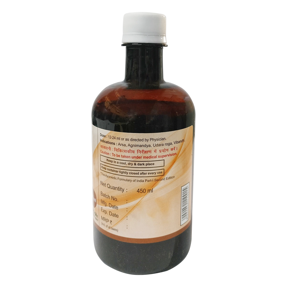 Clear dark brown liquid without frothing significant sedimentation, with aromatic odour bitter taste. As directed by the physician. Haritaki, Draksa, Madhuka, kusuma, Vidanga, Goksura, Guda, Trivrt,Dhaniya, dhatki, Indravaruni, cavya, Misreya, Saunthi, Danti, Mocarasa. 12-24 ml or as directed by the physician.