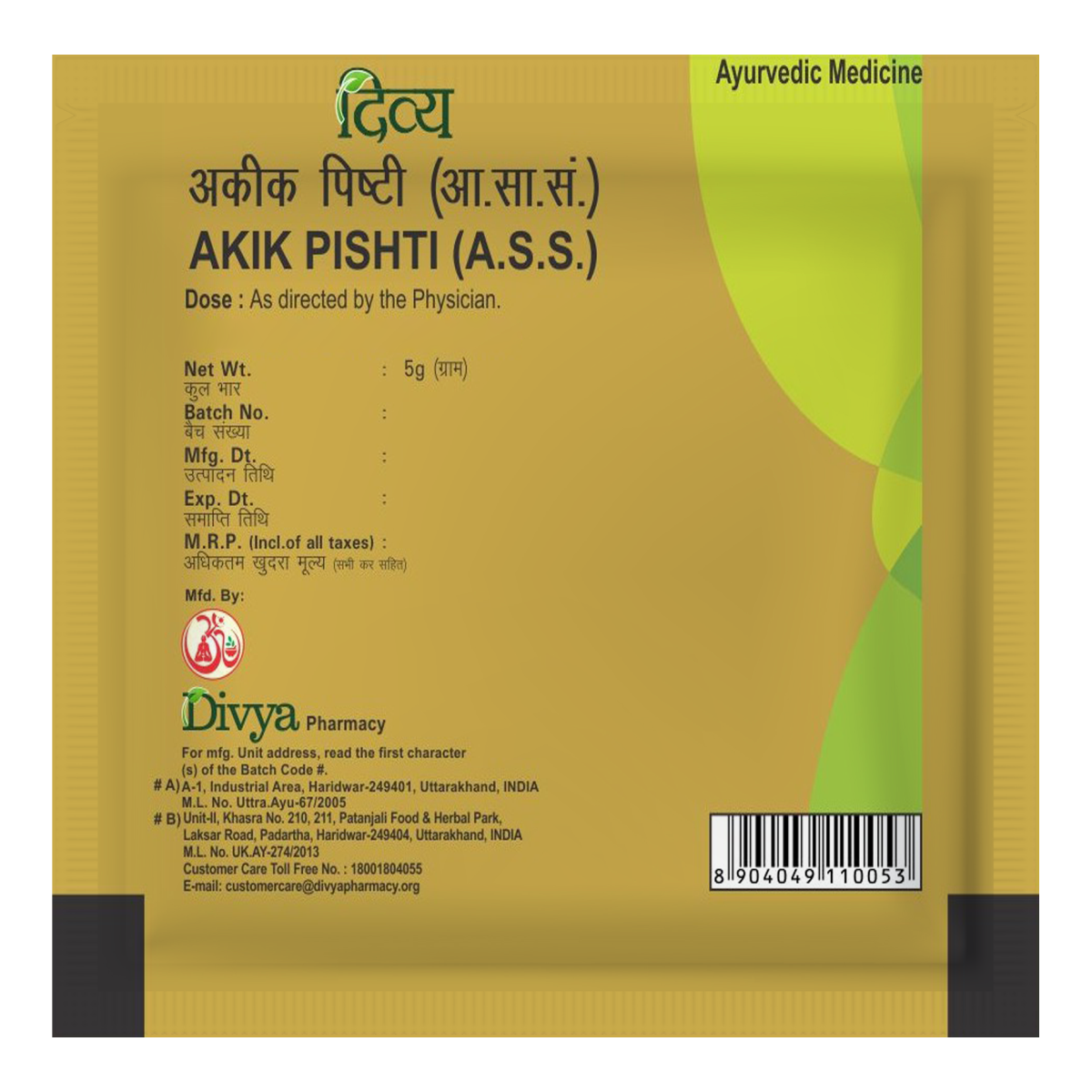 Light to dark grey colour, characteristic odour fine powder To be taken under medical supervision. 125-375 mg honey or butter empty stomach twice daily or as directed by the physician.