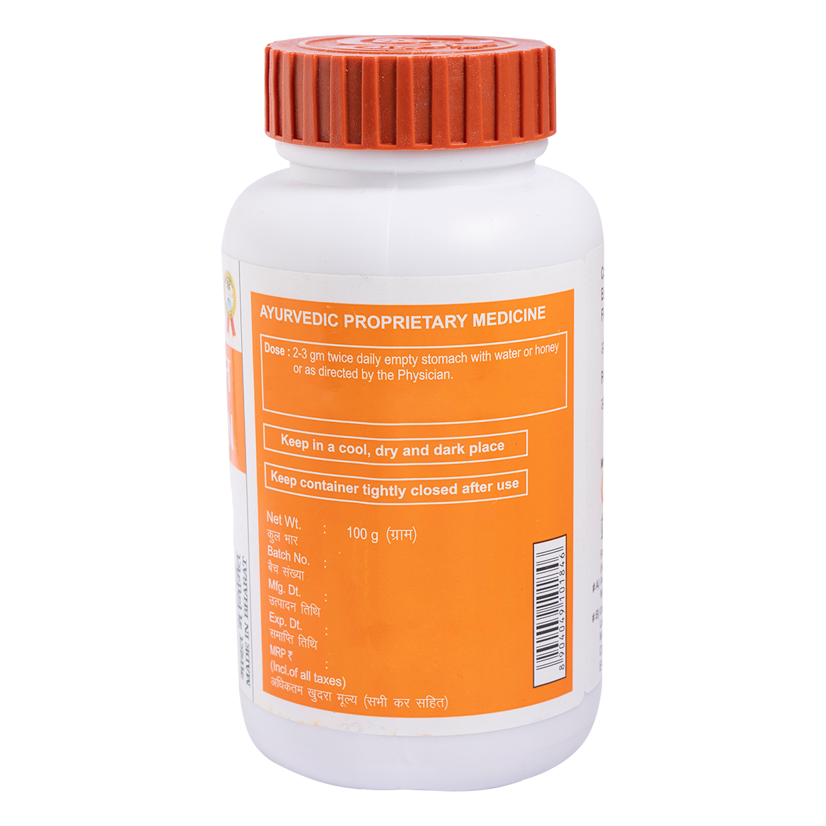 Light to dark brown colour, characteristic odour & astringent taste, fine powder. To be taken under medical supervision. 2-3 g mix with unequal quantity of honey & cow's ghee twice daily empty stomach or as directed by the physician.