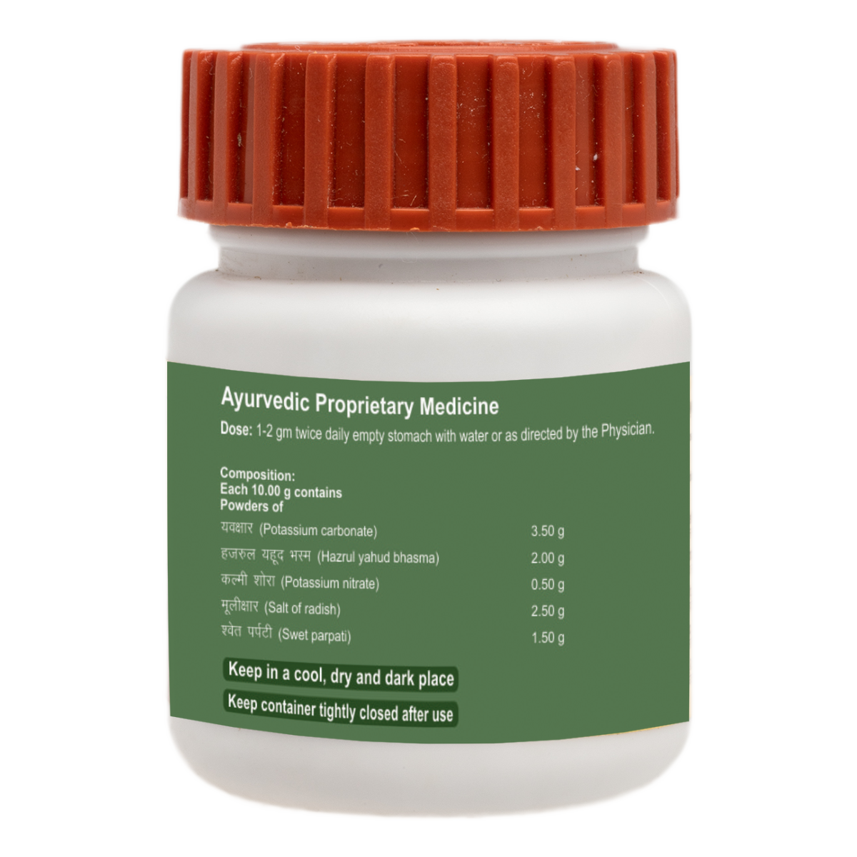 Buff colour, characteristic odour pungent taste, fine powder. Yavkshar,hazul yahud bhasma,Kalmi shora,Mulikshar,Swet parpati. To be taken under medical supervision. 1-2 g twice daily empty stomach with water or vrikkdoshhar kwath or as directed by the physician.