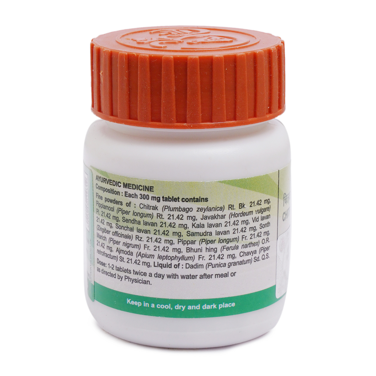 Light to dark brown colour, round biconvex uncoated tablet characteristic of asafoetida odour saline taste. Chitrak,Pipplamool,Javakhar,Sendha lavan,Kala lavan,Vid lavan,Sonchal namak,Samudra lavan,Sonth,Pippar,Marich,Bhuni hing,Ajmoda,Chavya,Nimbu. To be taken under medical supervision. 2 to 4 Tablets with water thrice daily or as directed by the Physician.