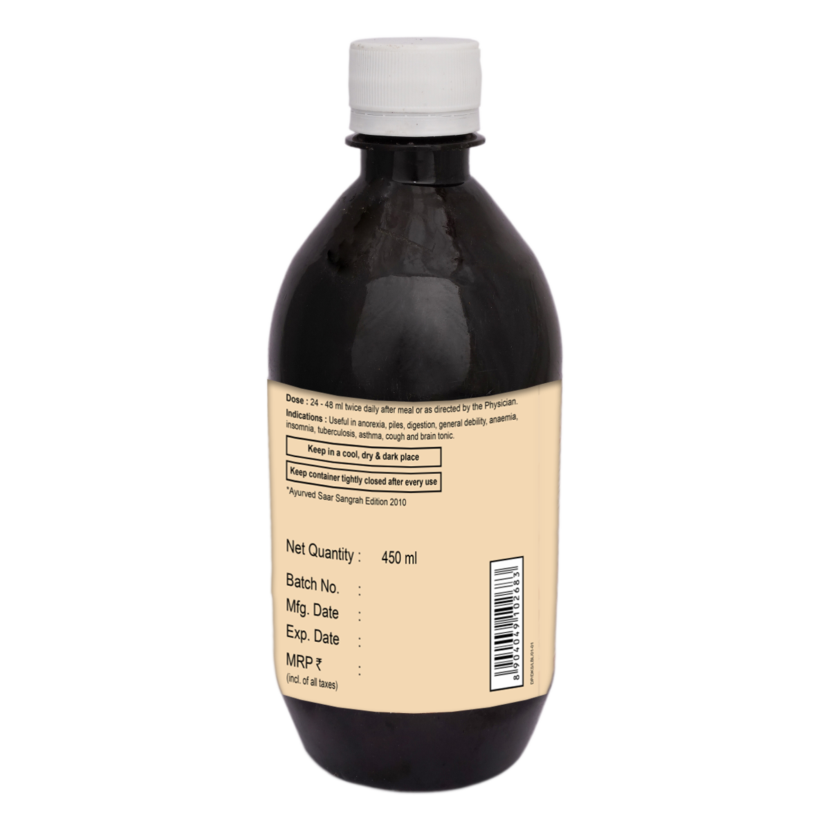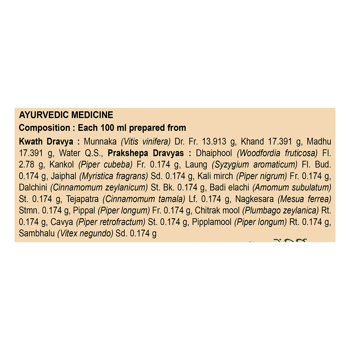 Clear brown liquid without frothing & significant sedimentation with aromatic odour & sweet taste. Munnaka, Khand, Madhu, Water, Dhaiphool, Kankol, Laung, Jaiphal, Kali mirch, Dalchini, Badi elachi, Tejapatra, Nagkesara, Pippal, Chitrak mool, Cavya, Pipplamool, Sambhalu To Be Taken Under Medical Supervision. 24- 48 ml twice a day after meals or as directed by the physician.