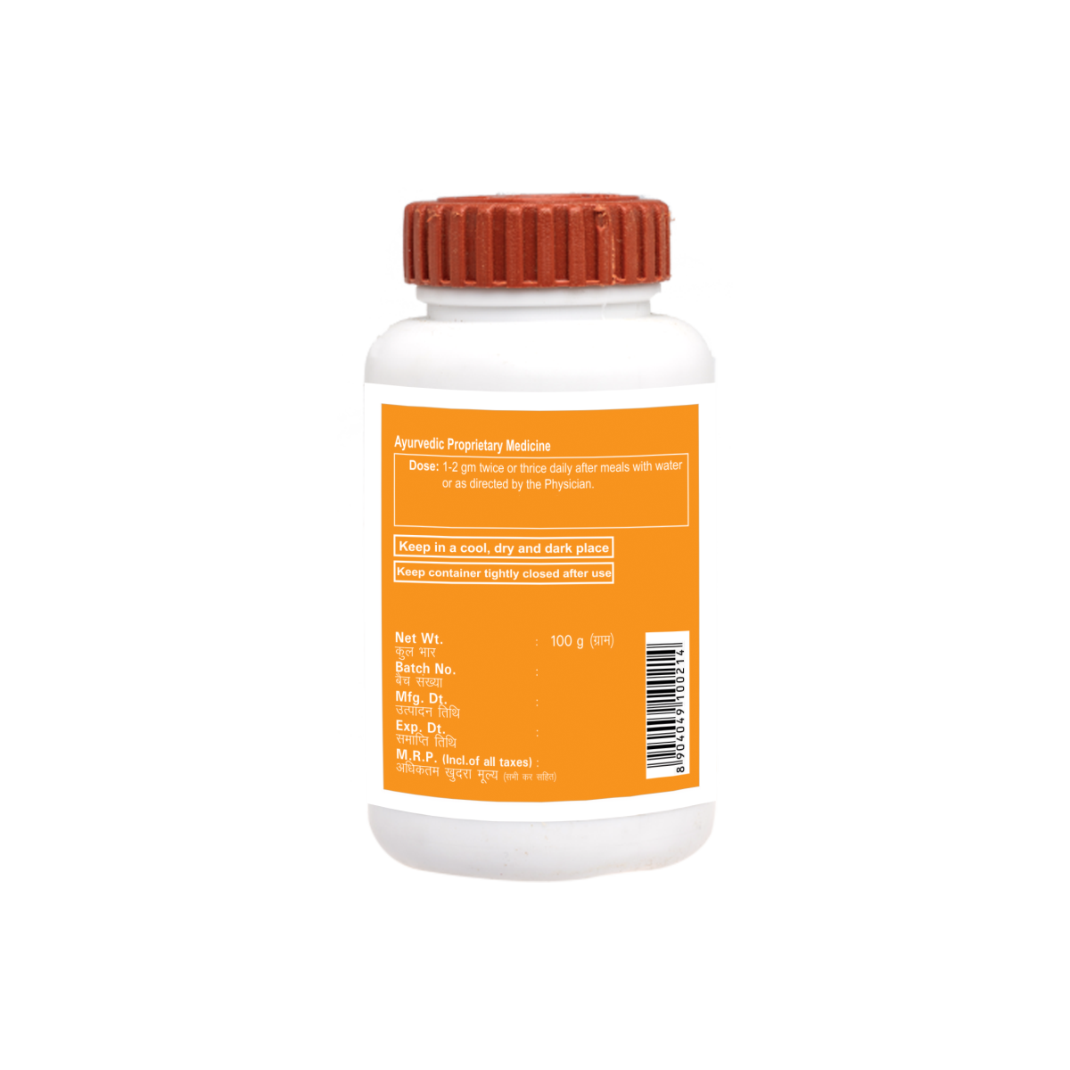 Dark brown colour, characteristic odour & salty taste, fine powder. Ajwain, Kali mirch,kala namak,Chhoti Harad, Jeera,Meetha soda, Nosadar,Nimbu Sat,Hing. To be taken under medical supervision. 1-3 g twice or thrice daily after meals with water or as directed by the physician.