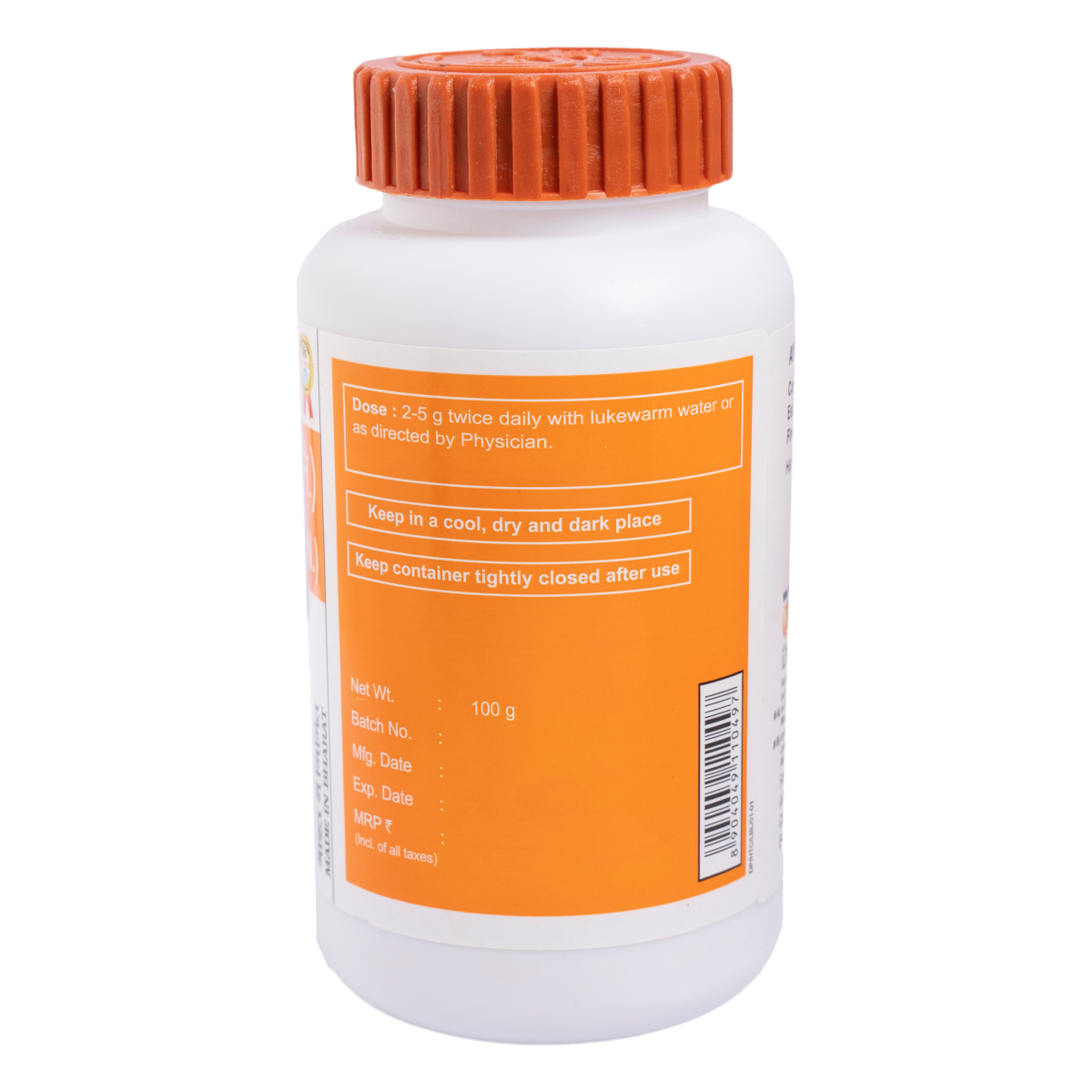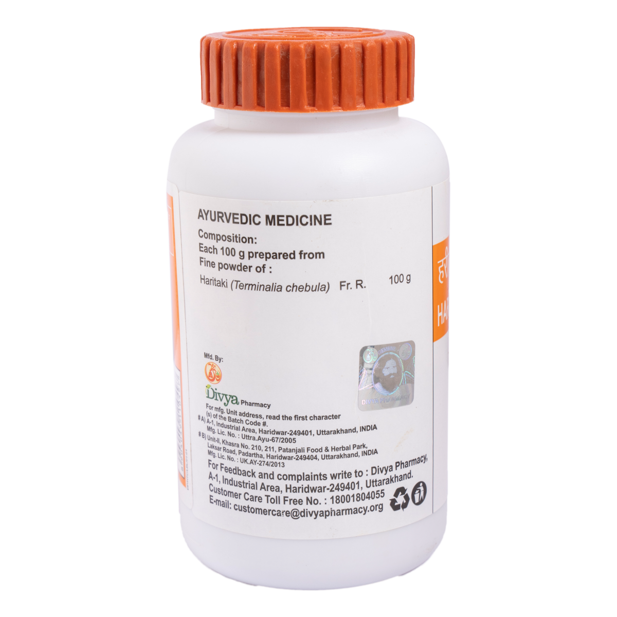 Yellow colour, characteristic odour, sweet & aromatic taste, fine powder. To be taken under medical supervision. Take 2-5 g of Divya Haritki Churn twice daily with lukewarm water or as directed by the physician.