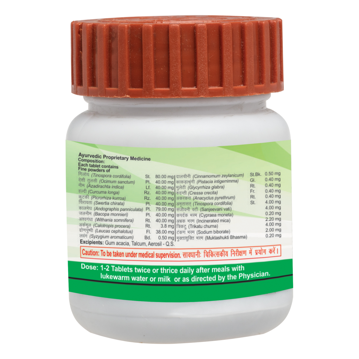 Light to dark brown colour, round biconvex film coated tablet with characteristic odour taste. As directed by the physician. Giloy, Desi tulsi, Neem, Haldi, Kutki, Chirayta, Kalmegh, Jal nimb, Ashwagandha, Aarkmool, Dronpuspi, Lavang, Dalchini, kakdasingi, Mulethi, Rudanti, Akarkara, Amrita sat, Sanjeevani vati, Kapadak bhasma, Trikatu, Abhrak bhasma, Pippal, Marich, Tankan bhasma, Muktashukti bhasma. To be taken under medical supervision. As directed by the physician.